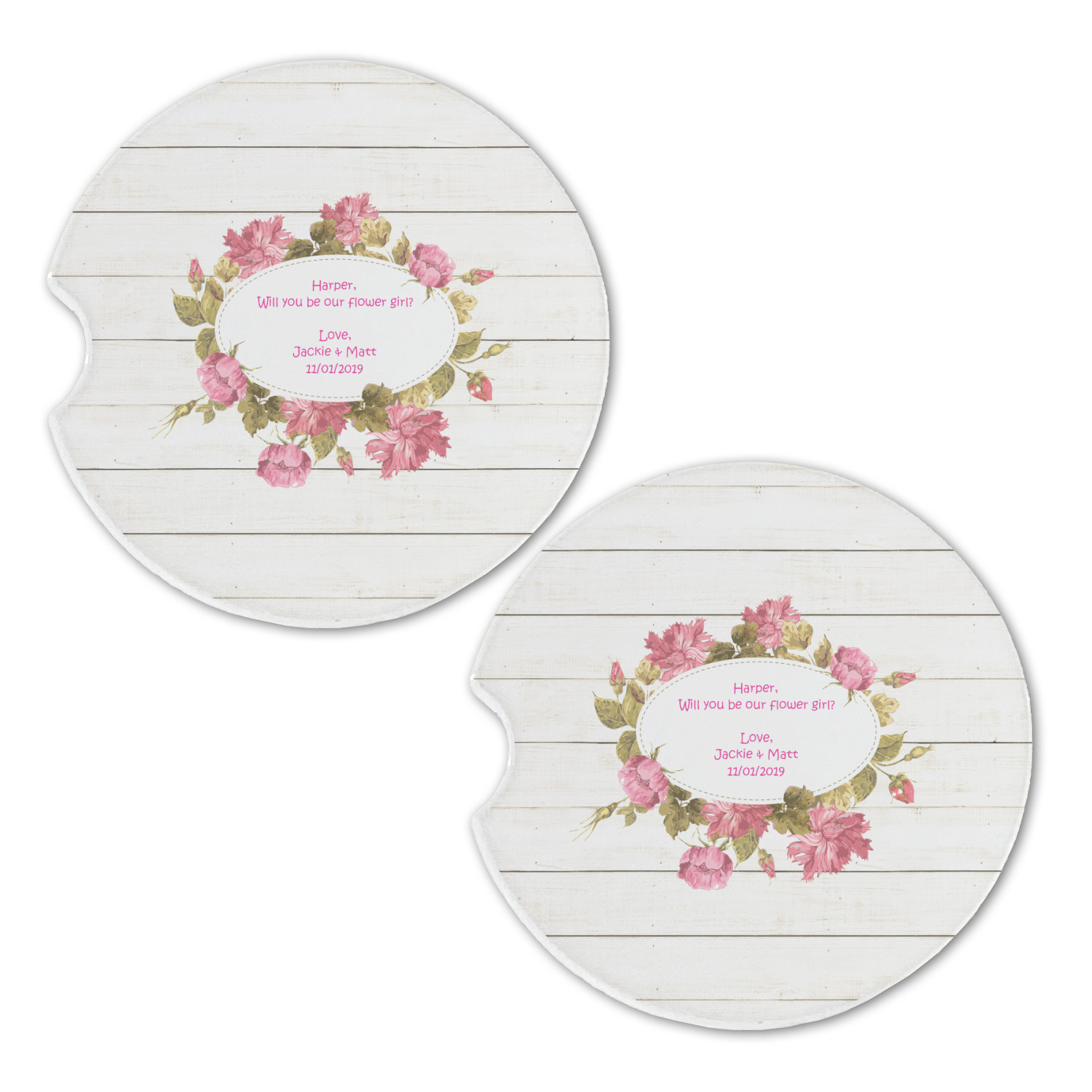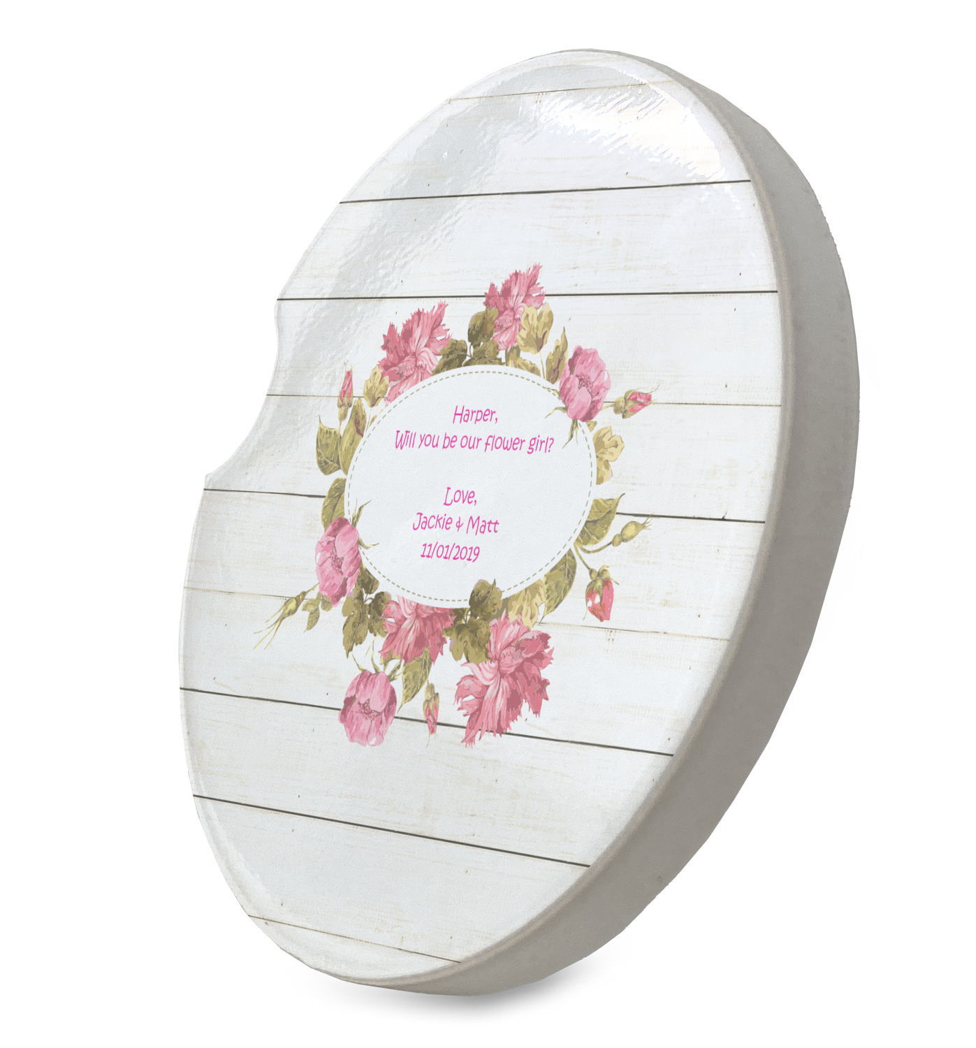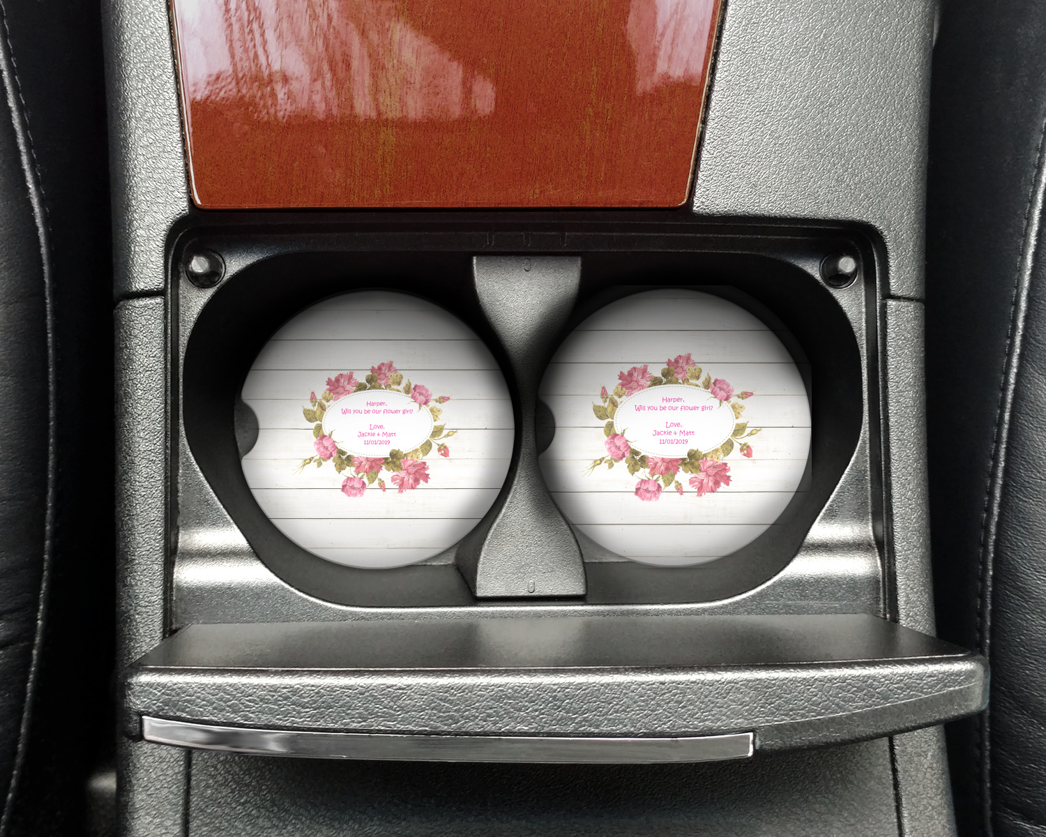 These sandstone coasters are round, robust, and feature a smoothed glossy side to exhibit your customized design. With a 2.5 inch diameter, these stone coasters will fit snugly inside most cup holders. This model also features a semi-circle shaped divot that allows for easy removal, despite the tight fit. You can purchase these car cup holder coasters in a pair, or singularly, depending on your needs.