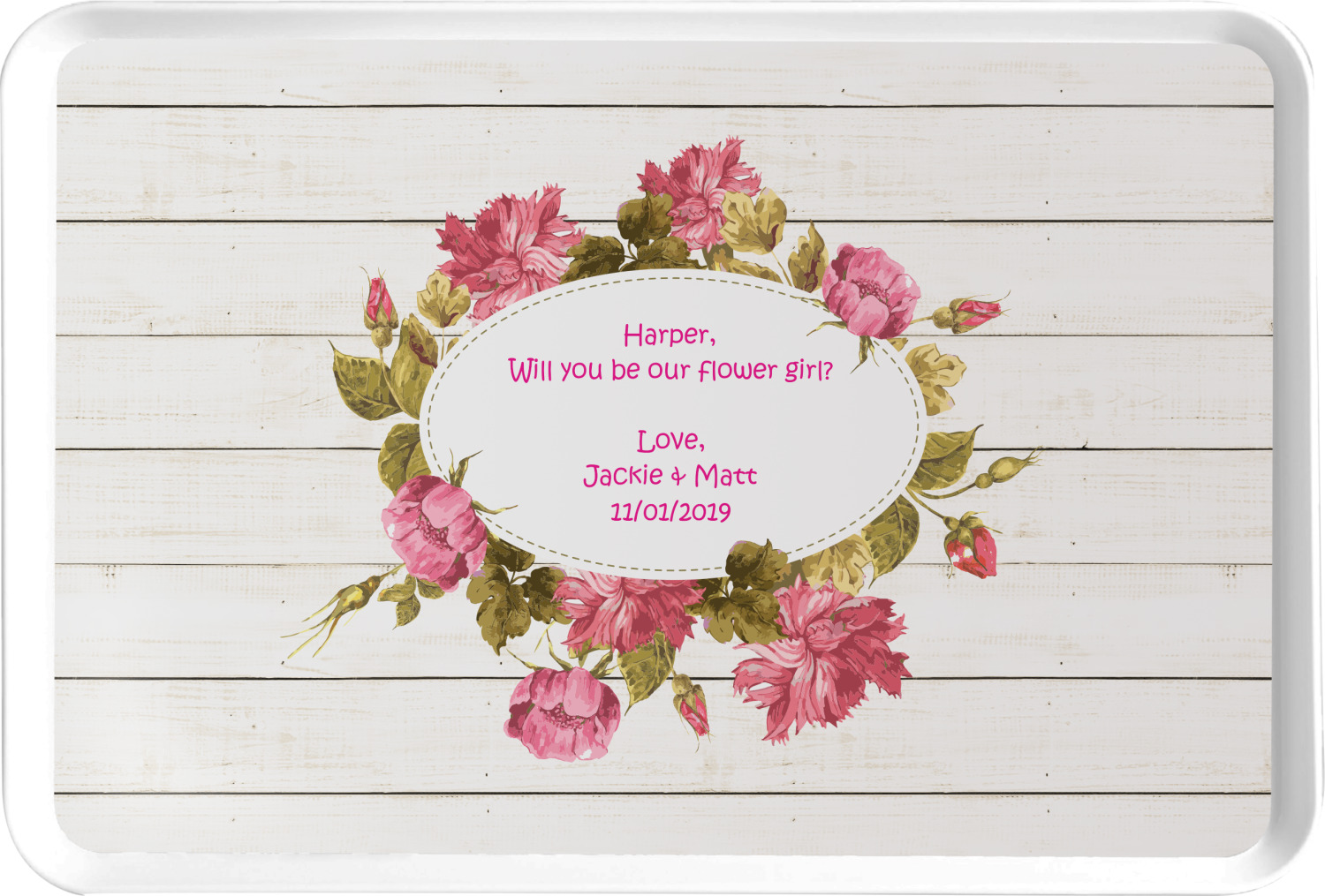 The main design has a background of weathered wooden planks. A beautiful light pink flower frame is used as the focal point of this design. The pink color of the frame and the personalization inside is the perfect contrast to the light colored wood.