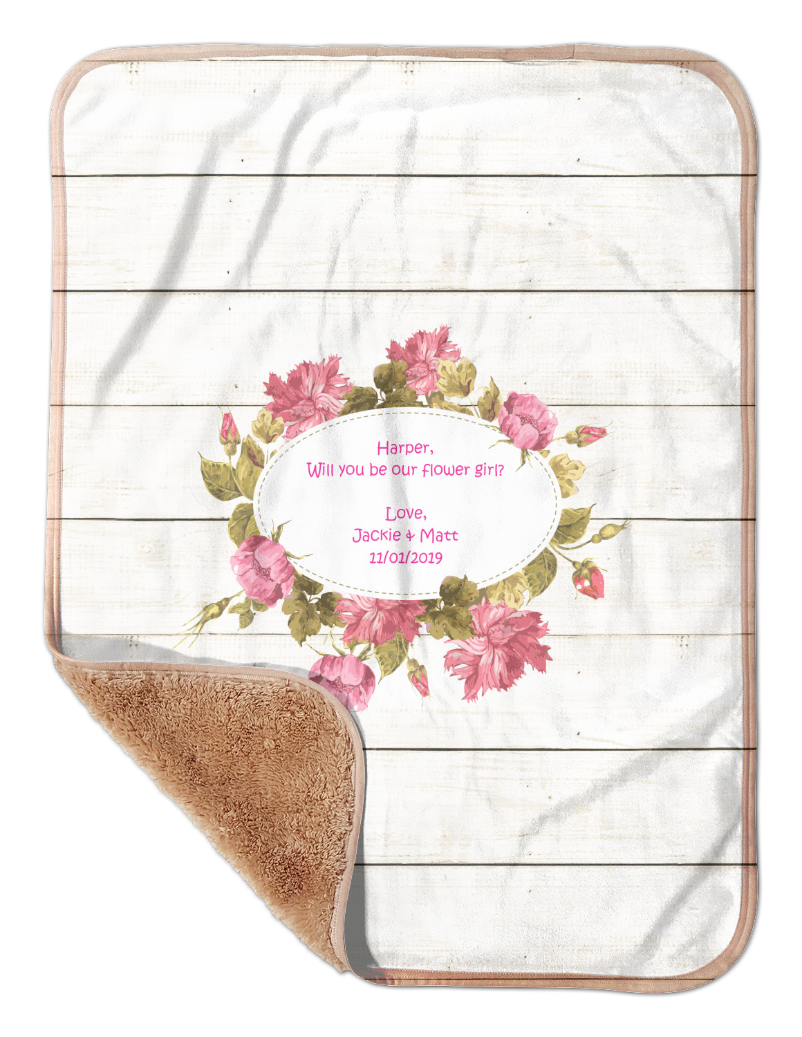 The main design has a background of weathered wooden planks. A beautiful light pink flower frame is used as the focal point of this design. The pink color of the frame and the personalization inside is the perfect contrast to the light colored wood.