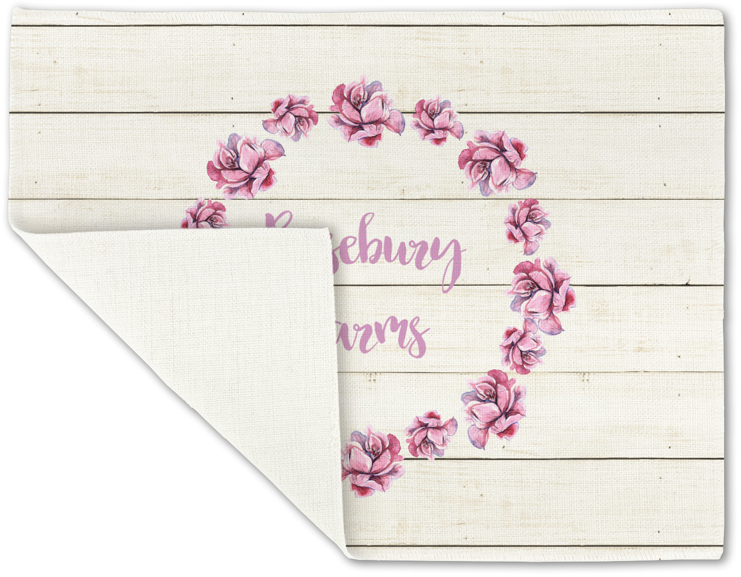 The main design has a background of weathered wooden planks. A beautiful light pink flower frame is used as the focal point of this design. The pink color of the frame and the personalization inside is the perfect contrast to the light colored wood.