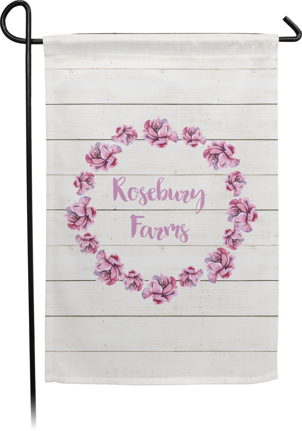 These custom garden flags are made of a durable, double-ply, polyester weave, allowing them to withstand the elements year round. The small flags measure at approximately 12 by 18 inches. The large flags measure out to 28 by 37 inches. You can order these decorative flags with your customization printed on the front only, or the front and back.