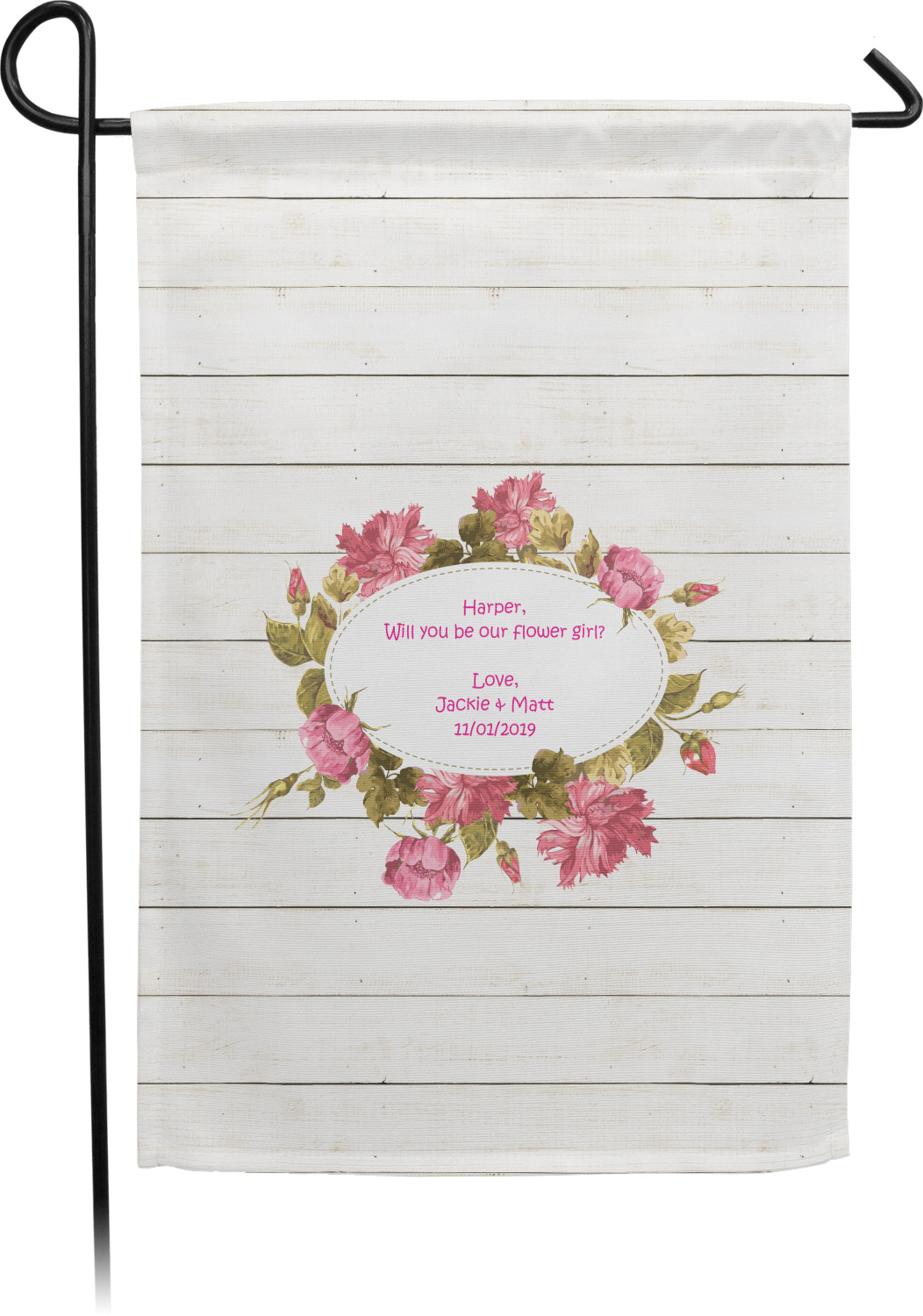 These custom garden flags are made of a durable, double-ply, polyester weave, allowing them to withstand the elements year round. The small flags measure at approximately 12 by 18 inches. The large flags measure out to 28 by 37 inches. You can order these decorative flags with your customization printed on the front only, or the front and back.