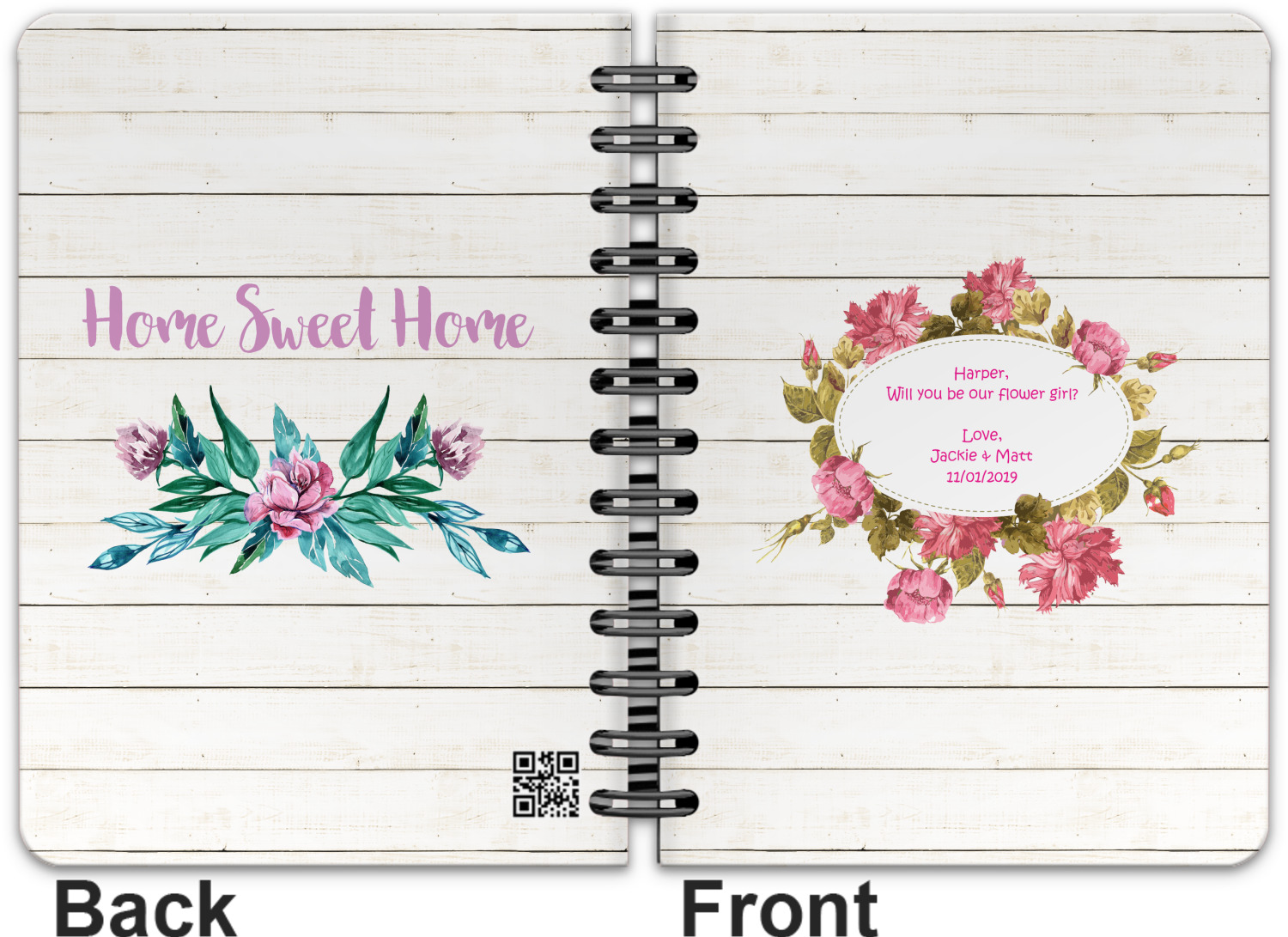 This spiral notebook includes 75 sheets of thick, ruled paper. The front and back of this custom notebook is made of a robust, laminate, plastic covering. We print your personalization on these two panels, underneath a glossy finish, which emphasizes the colors of your design. The two panels and the sheets of paper are held together by a sturdy, black coil. The paper within your bound notebook is perforated for easy, clean tearing.