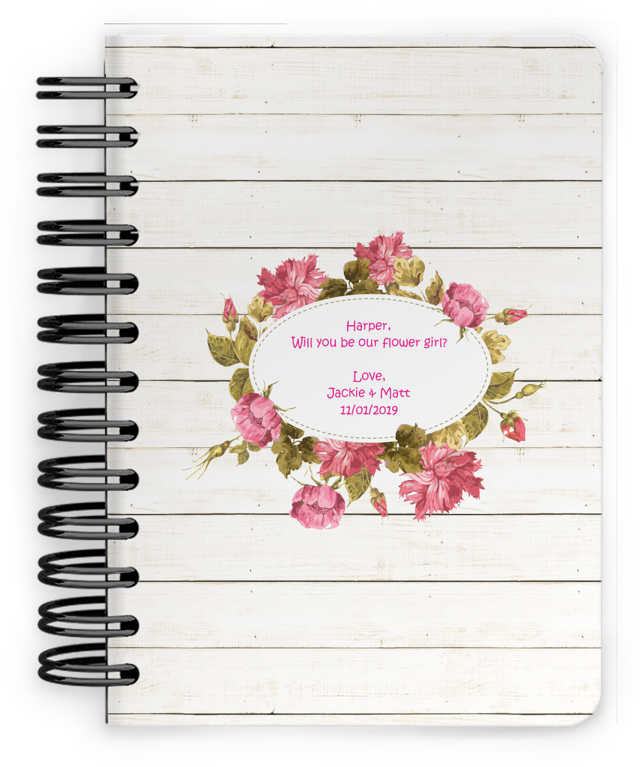 The main design has a background of weathered wooden planks. A beautiful light pink flower frame is used as the focal point of this design. The pink color of the frame and the personalization inside is the perfect contrast to the light colored wood.