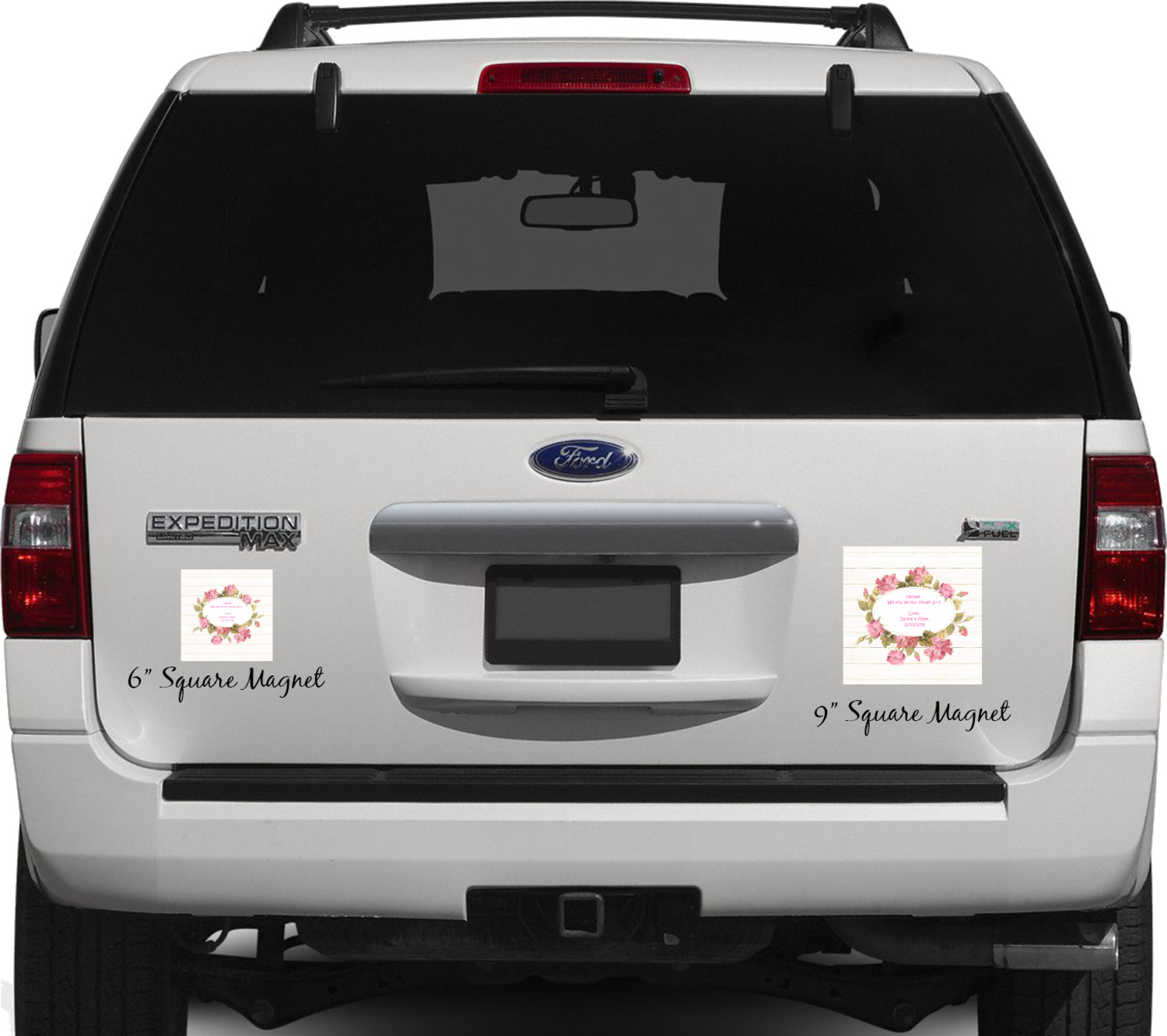 Your personalized car magnets are available for purchase in two shapes and two sizes. We carry round and square editions; each shape can either be 6 by 6 inches, or 10 by 10 inches, depending on your needs. Both versions are 1 millimeter thick, which is considered, within the industry, as the ideal thickness for automobile magnets. The magnetic car decals will adhere to any smooth, metal surface of your cars body, such as the trunk door or a side panel. However, please note that some vehicles are constructed from fiberglass bodies, which prevents the adhesion of anything magnetic. We advise that you test your vehicle before purchasing these magnets.