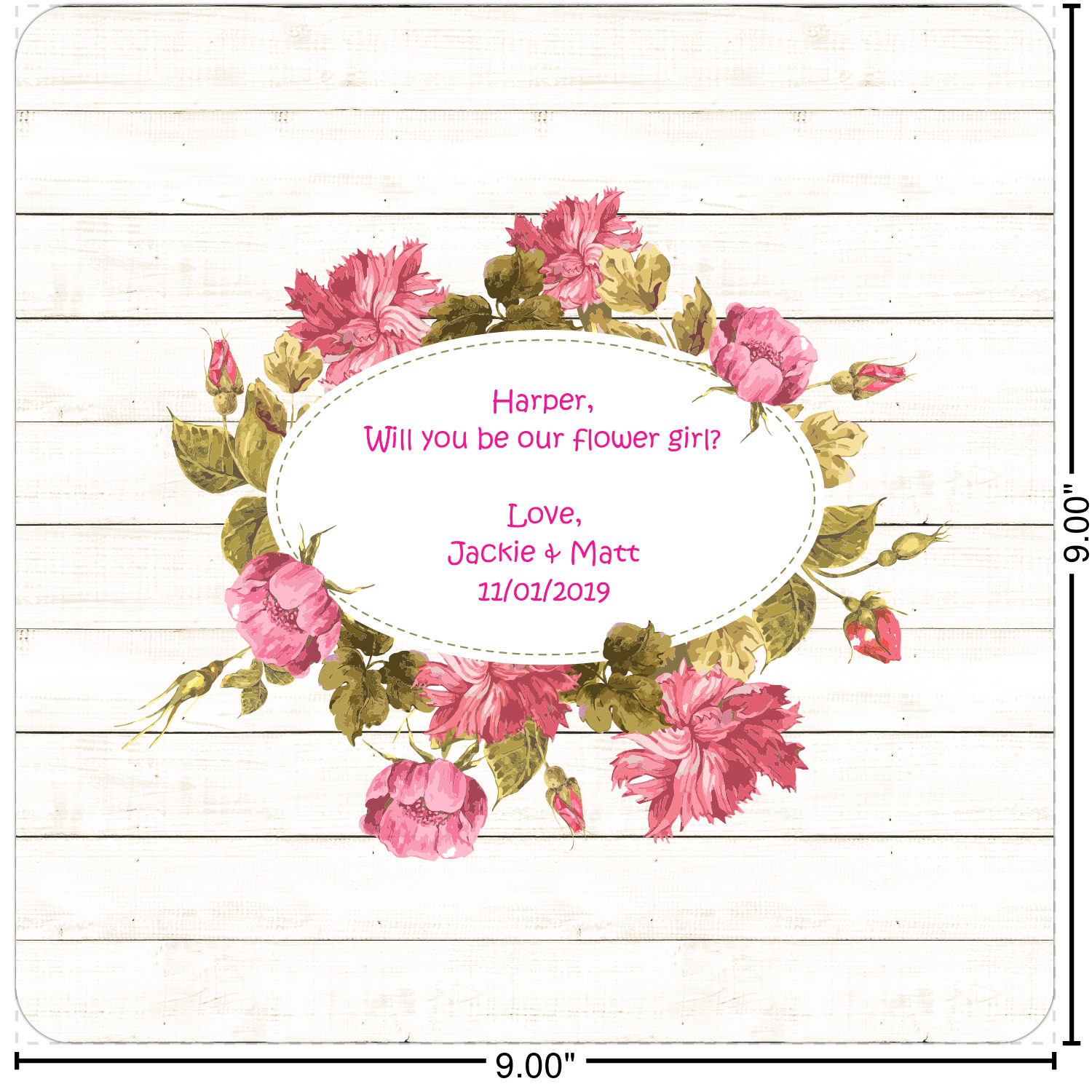 The main design has a background of weathered wooden planks. A beautiful light pink flower frame is used as the focal point of this design. The pink color of the frame and the personalization inside is the perfect contrast to the light colored wood.
