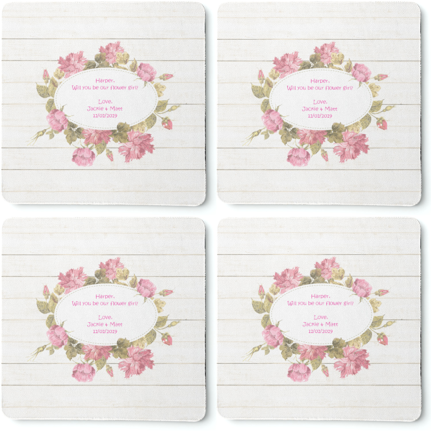 The main design has a background of weathered wooden planks. A beautiful light pink flower frame is used as the focal point of this design. The pink color of the frame and the personalization inside is the perfect contrast to the light colored wood.