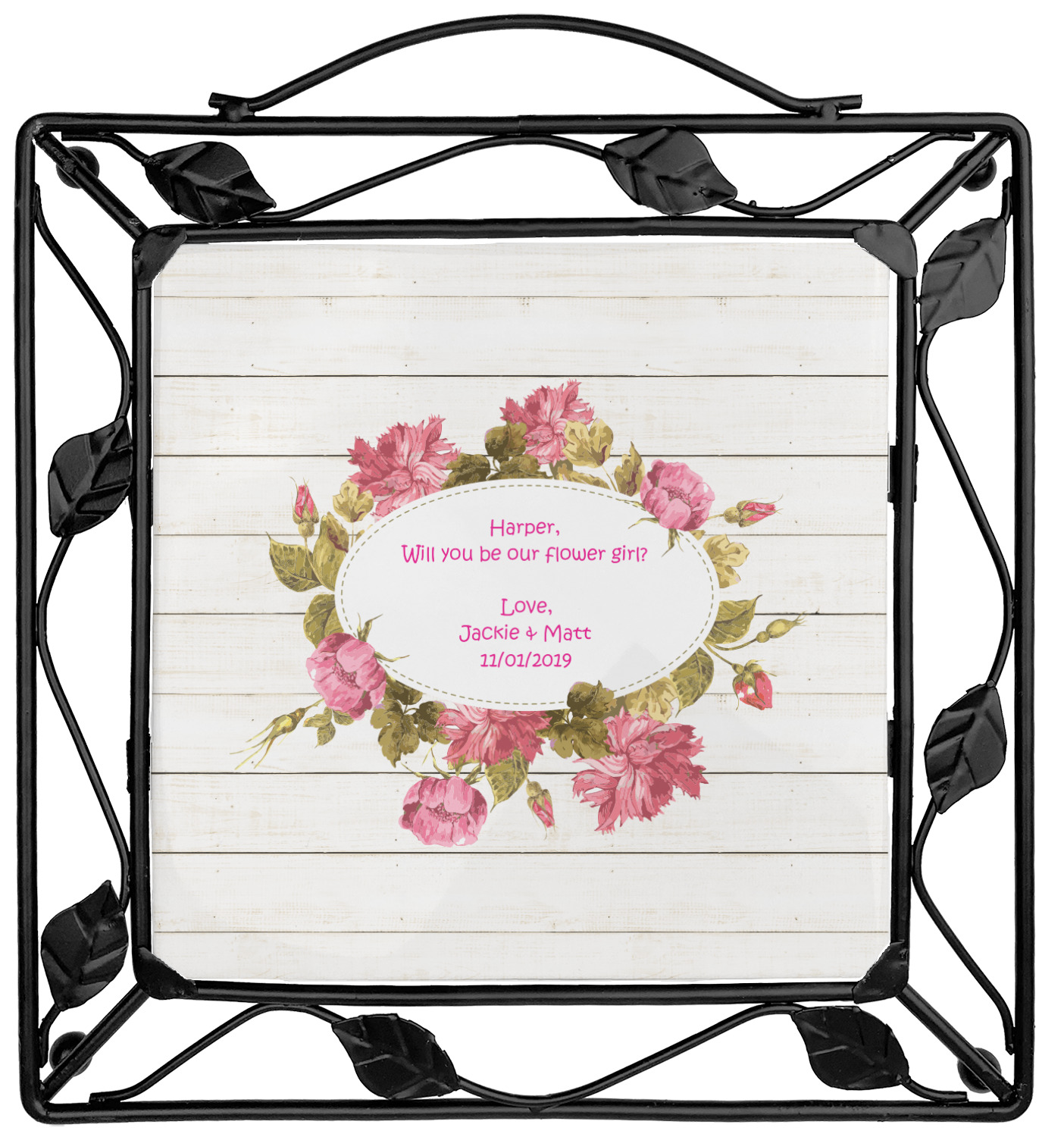 The main design has a background of weathered wooden planks. A beautiful light pink flower frame is used as the focal point of this design. The pink color of the frame and the personalization inside is the perfect contrast to the light colored wood.