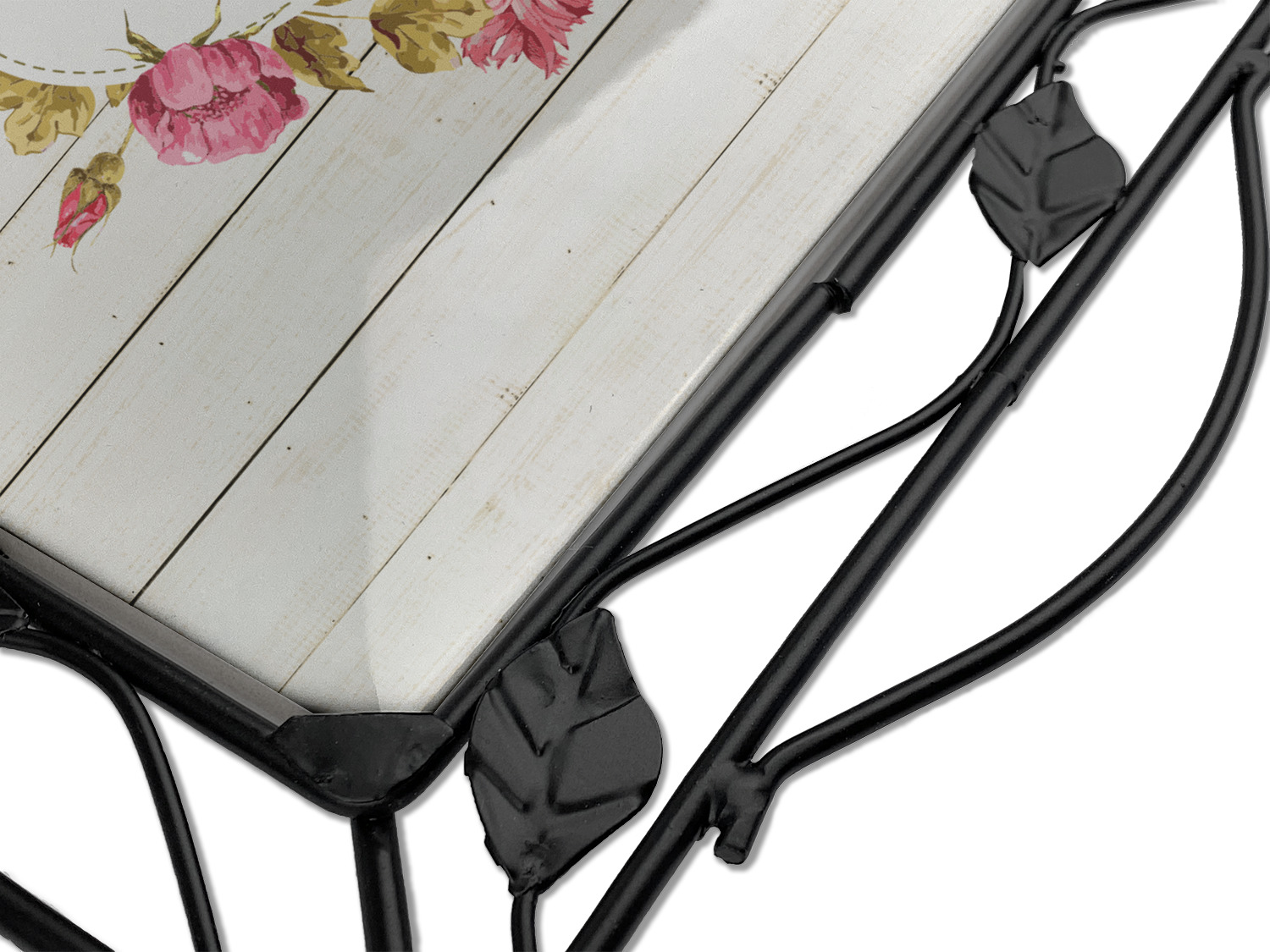 Our square trivets are made from a durable, wrought iron. This model features 4 small half circles, one on each corner, and a larger ring of iron that circles the central, customized tile. Each of the 4 corners has a round foot on its bottom for stability. This trivet is 8.75 by 8.75 inches, but the central tile measures at 6 inches on both sides.