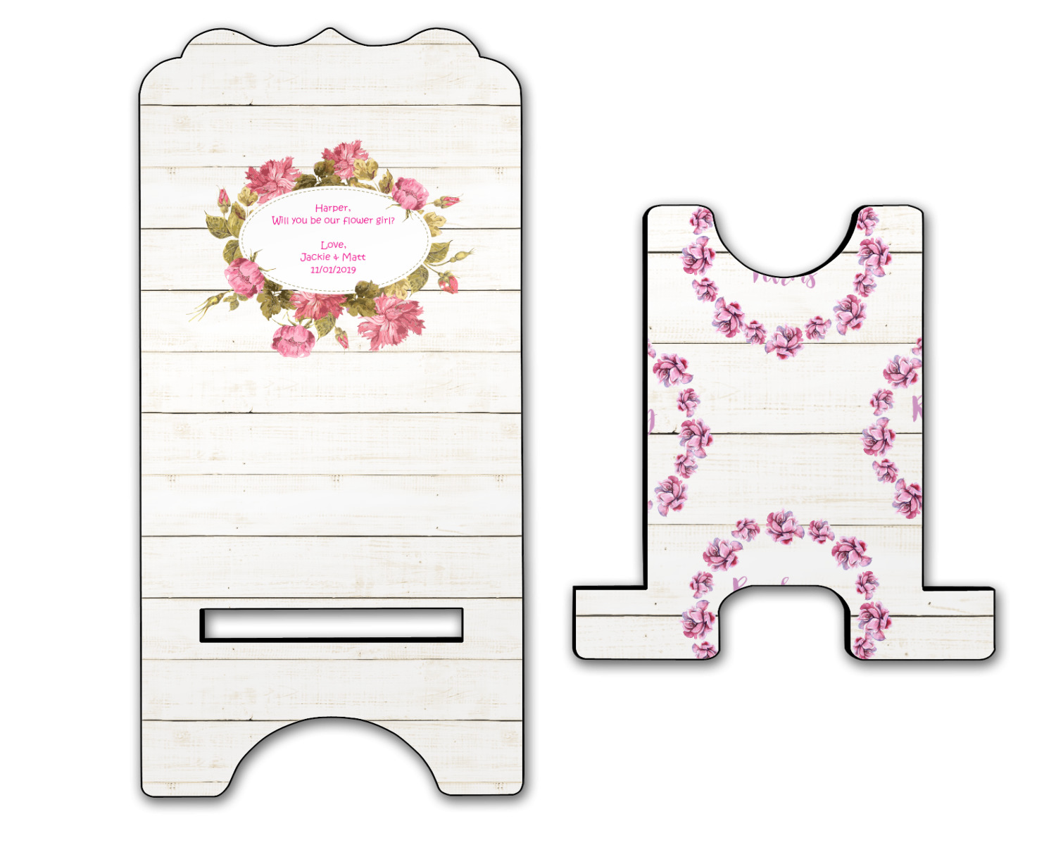 The main design has a background of weathered wooden planks. A beautiful light pink flower frame is used as the focal point of this design. The pink color of the frame and the personalization inside is the perfect contrast to the light colored wood.