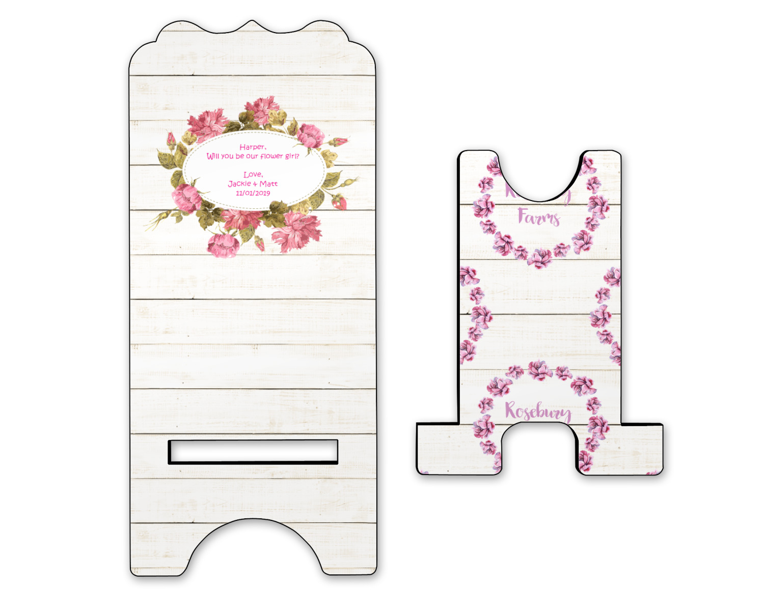 The main design has a background of weathered wooden planks. A beautiful light pink flower frame is used as the focal point of this design. The pink color of the frame and the personalization inside is the perfect contrast to the light colored wood.