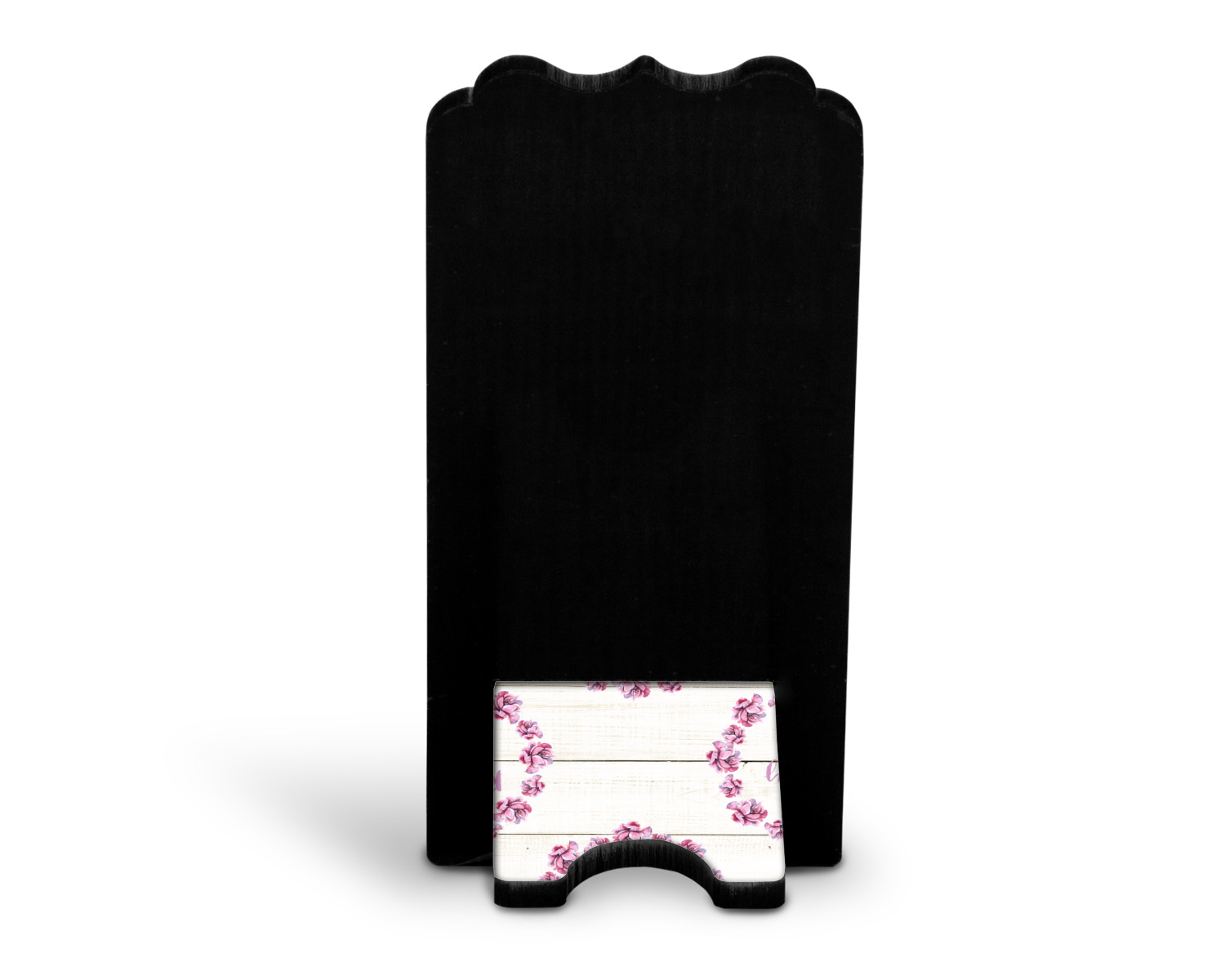 The coordinating design has the same wooden background with a flower illustration as the main graphic. This design is the perfect feminine touch to any accessory.