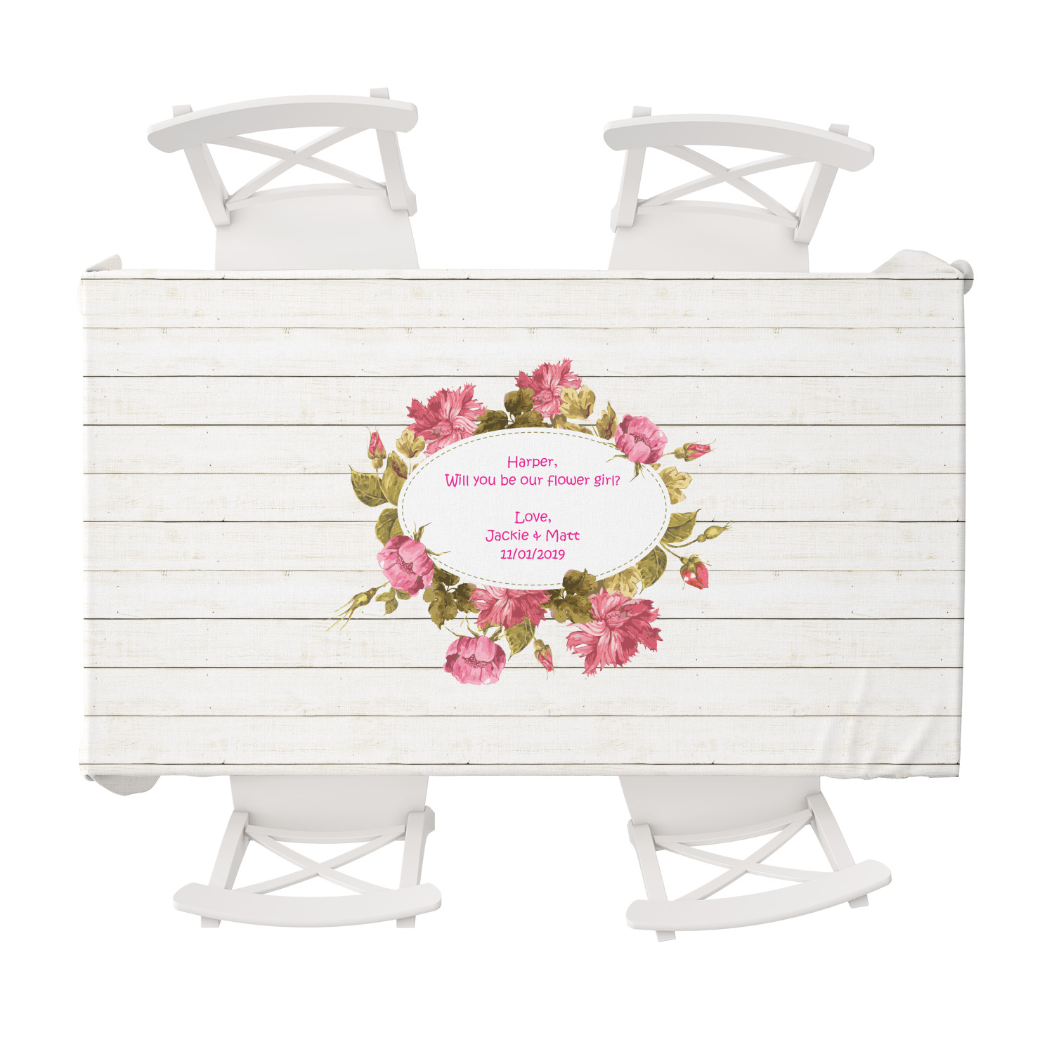 The main design has a background of weathered wooden planks. A beautiful light pink flower frame is used as the focal point of this design. The pink color of the frame and the personalization inside is the perfect contrast to the light colored wood.