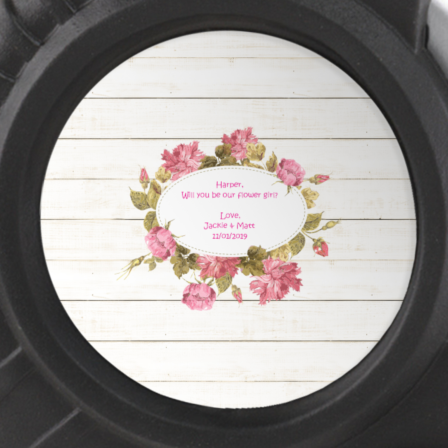 The main design has a background of weathered wooden planks. A beautiful light pink flower frame is used as the focal point of this design. The pink color of the frame and the personalization inside is the perfect contrast to the light colored wood.
