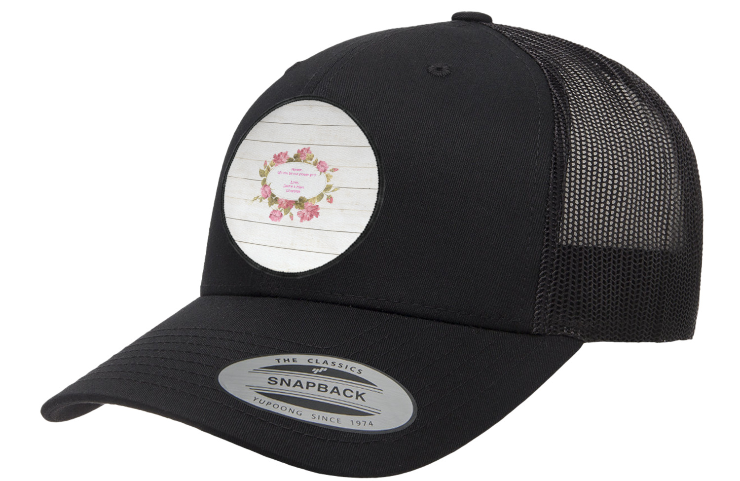The main design has a background of weathered wooden planks. A beautiful light pink flower frame is used as the focal point of this design. The pink color of the frame and the personalization inside is the perfect contrast to the light colored wood.