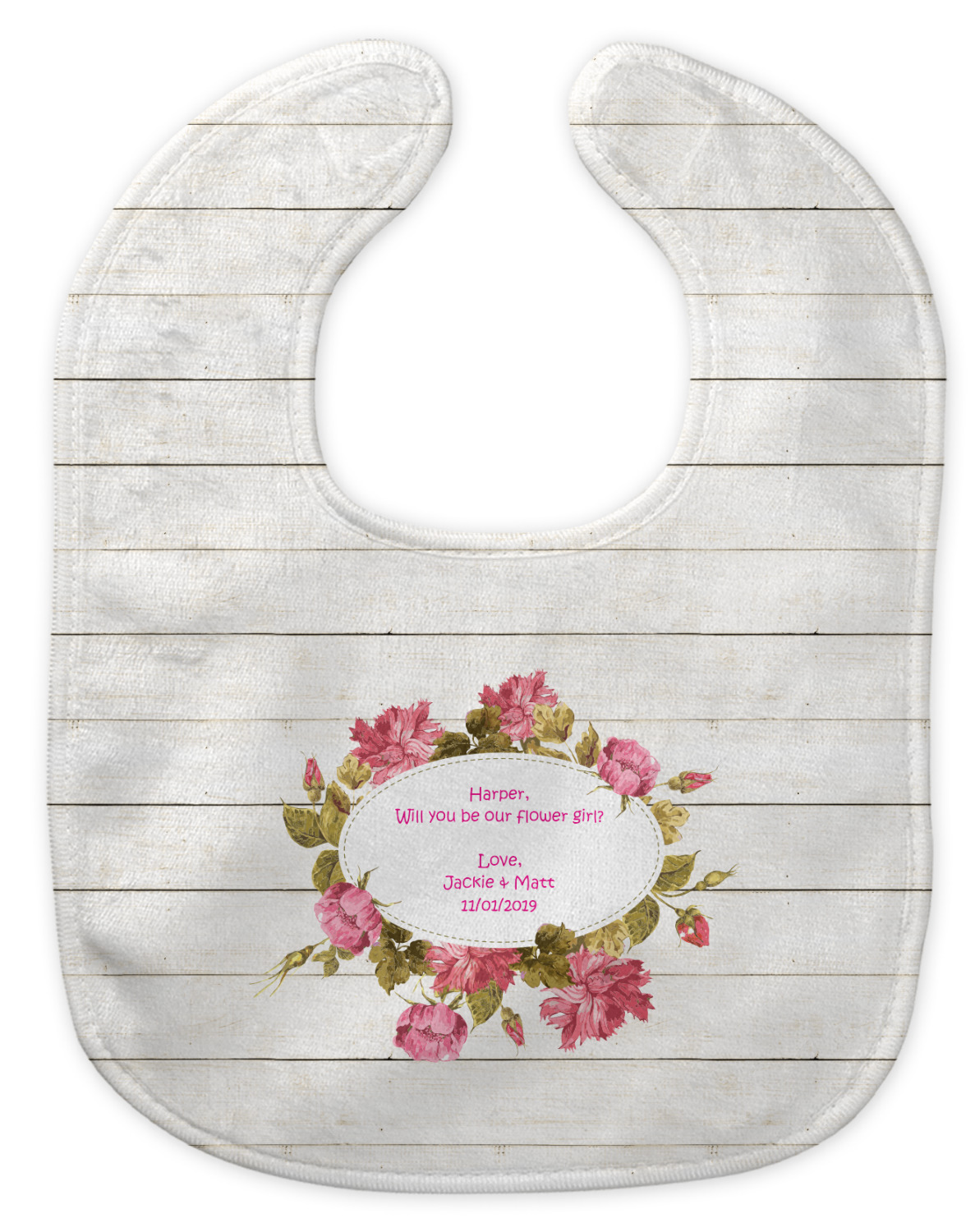The main design has a background of weathered wooden planks. A beautiful light pink flower frame is used as the focal point of this design. The pink color of the frame and the personalization inside is the perfect contrast to the light colored wood.