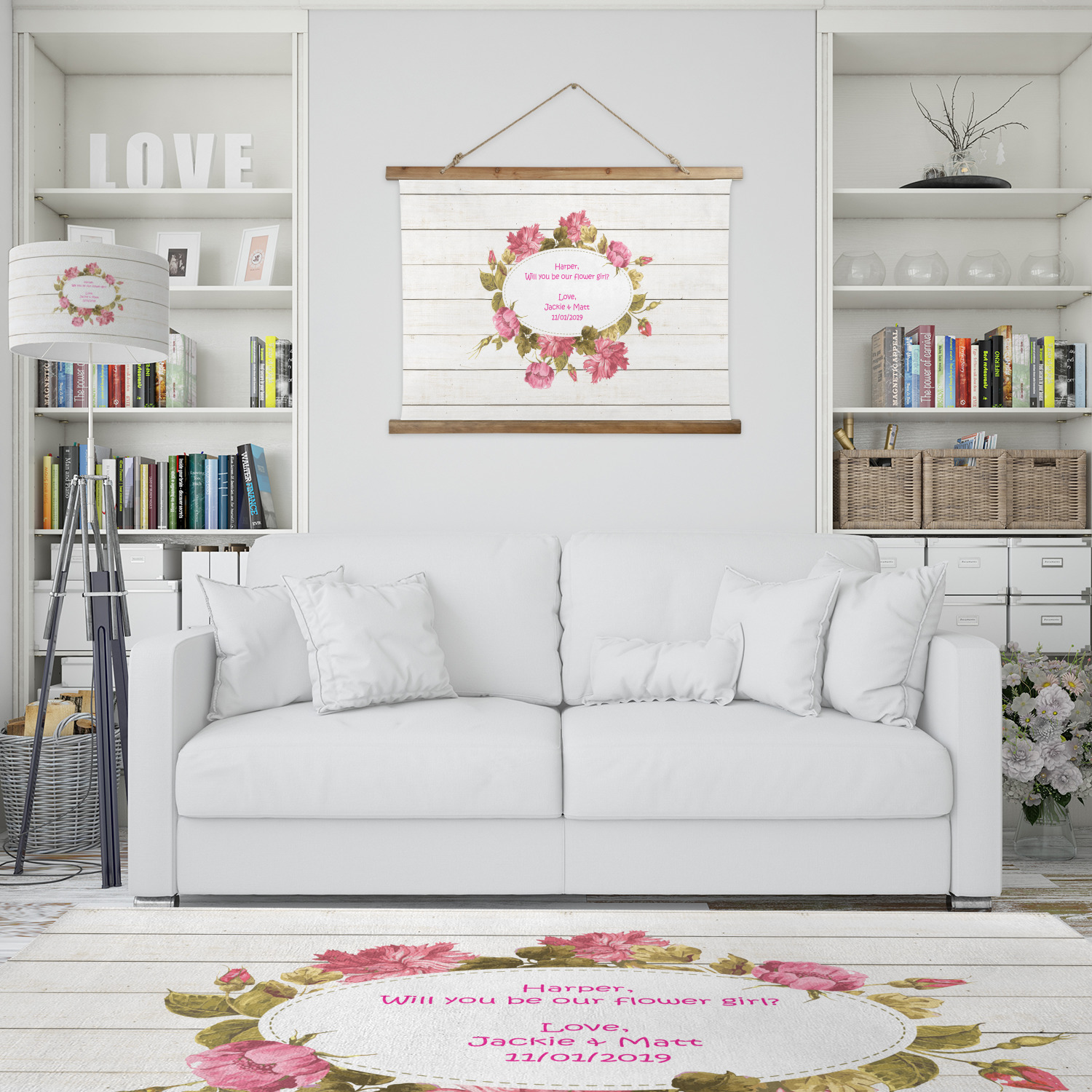 The main design has a background of weathered wooden planks. A beautiful light pink flower frame is used as the focal point of this design. The pink color of the frame and the personalization inside is the perfect contrast to the light colored wood.