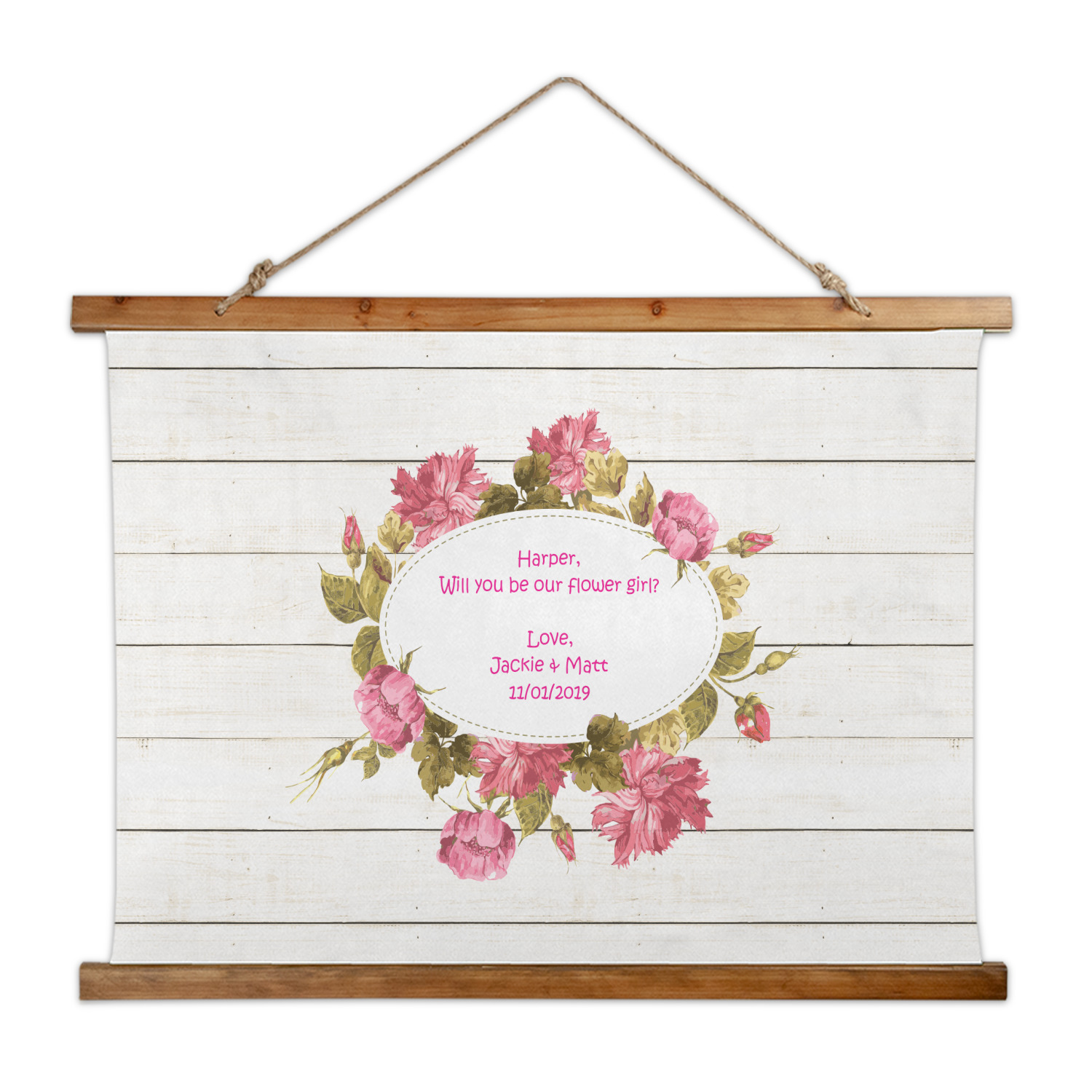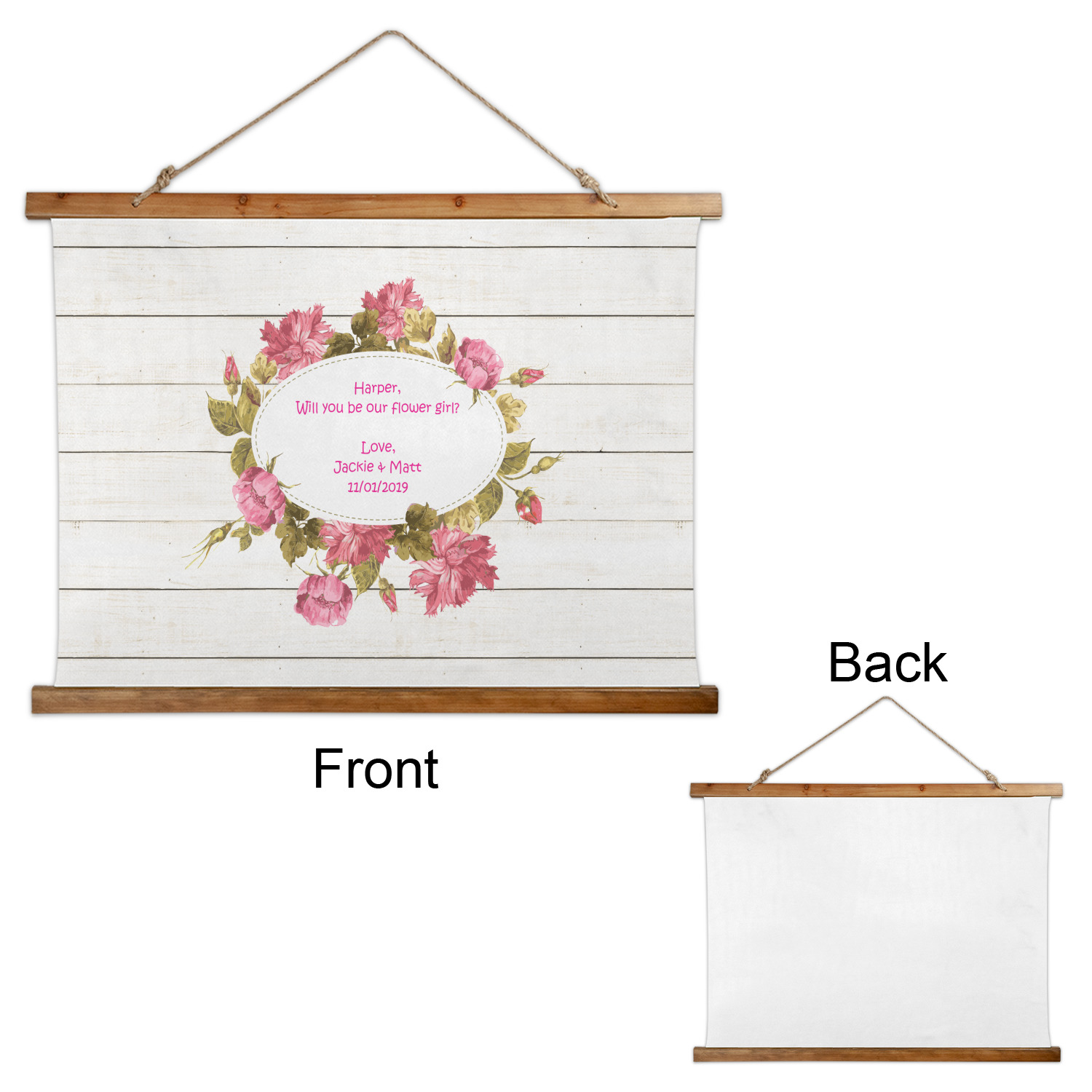 Made in two different orientations - portrait or landscape - both are 26" x 36". Your design is printed on a high quality polyester fabric with hemmed edges. The wood on the top and bottom of the tapestry is 1.25" tall and 0.25" thick and there are two pieces on top and bottom which sandwich the fabric.