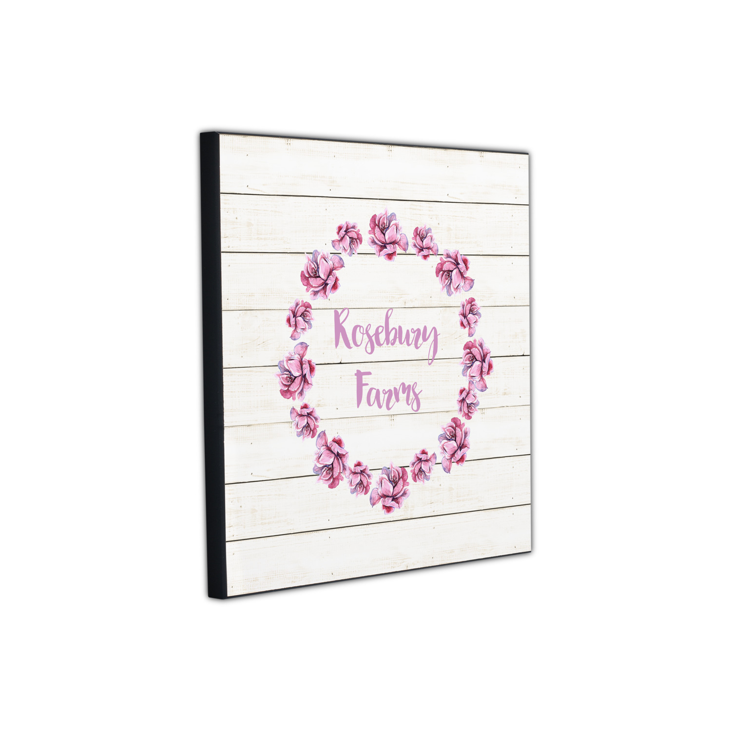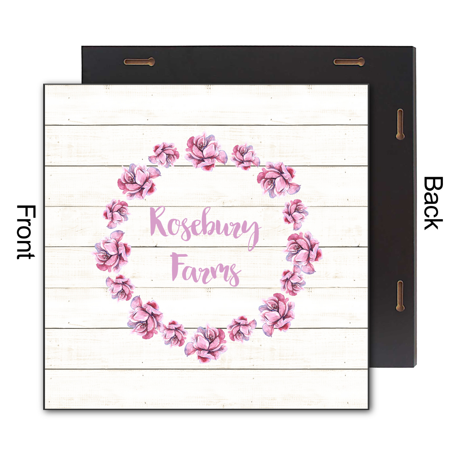 The main design has a background of weathered wooden planks. A beautiful light pink flower frame is used as the focal point of this design. The pink color of the frame and the personalization inside is the perfect contrast to the light colored wood.