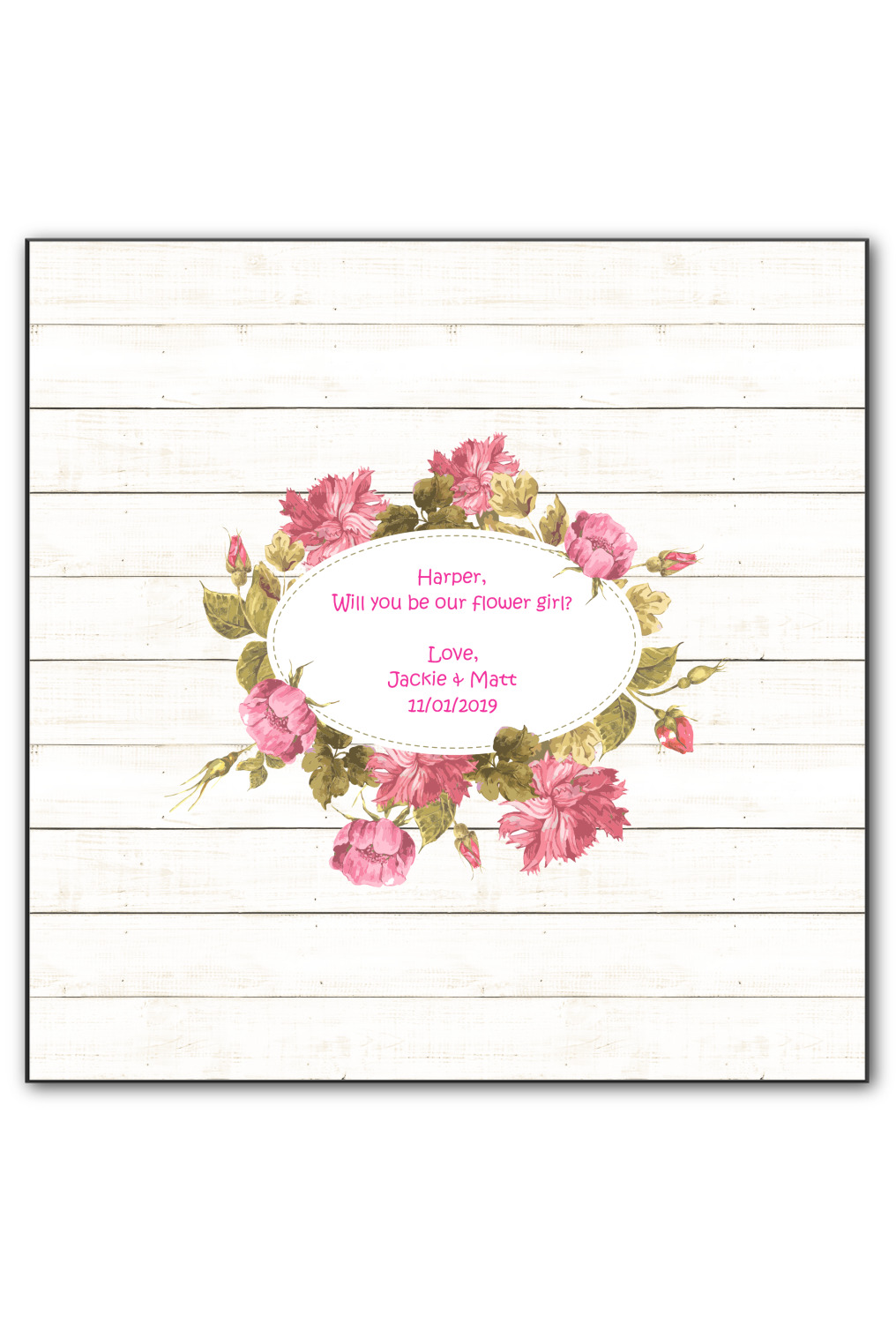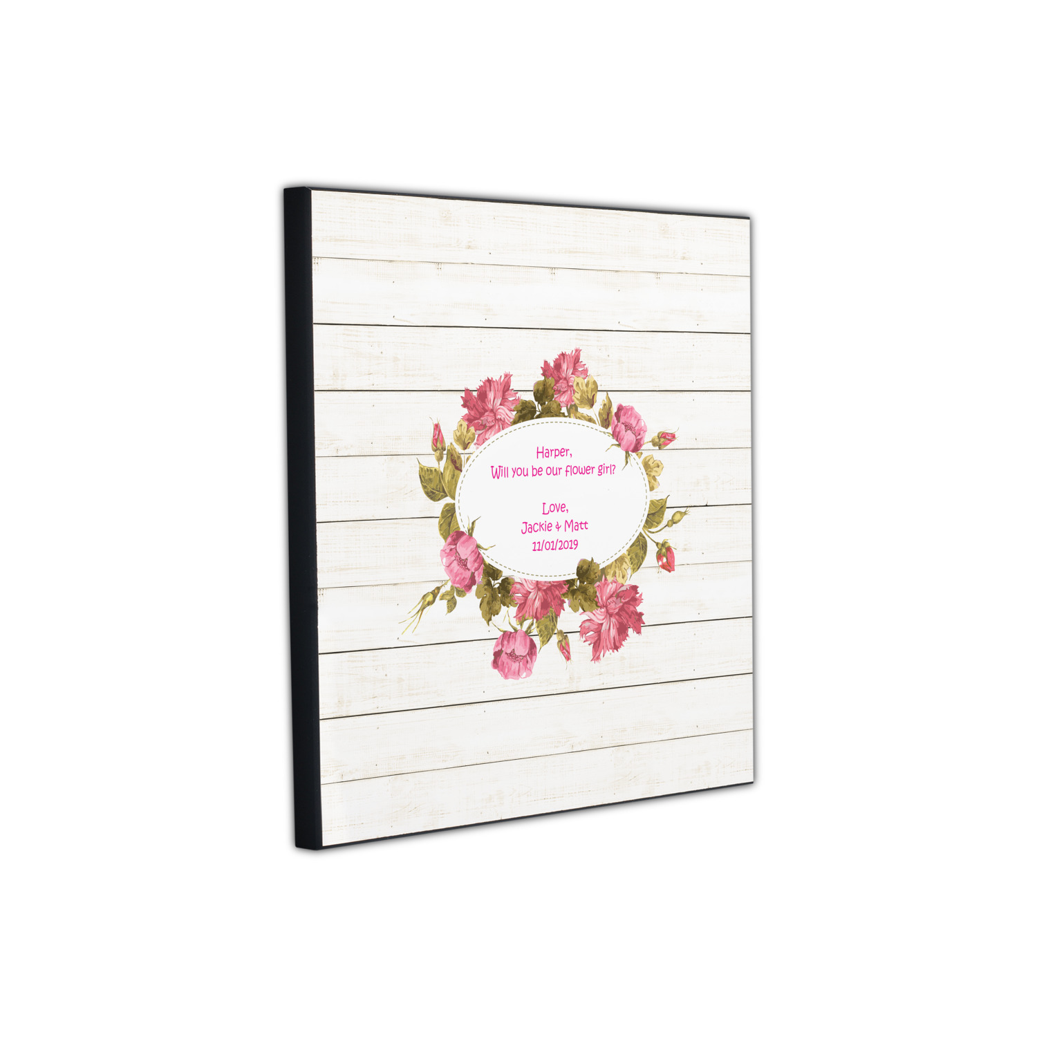 The main design has a background of weathered wooden planks. A beautiful light pink flower frame is used as the focal point of this design. The pink color of the frame and the personalization inside is the perfect contrast to the light colored wood.