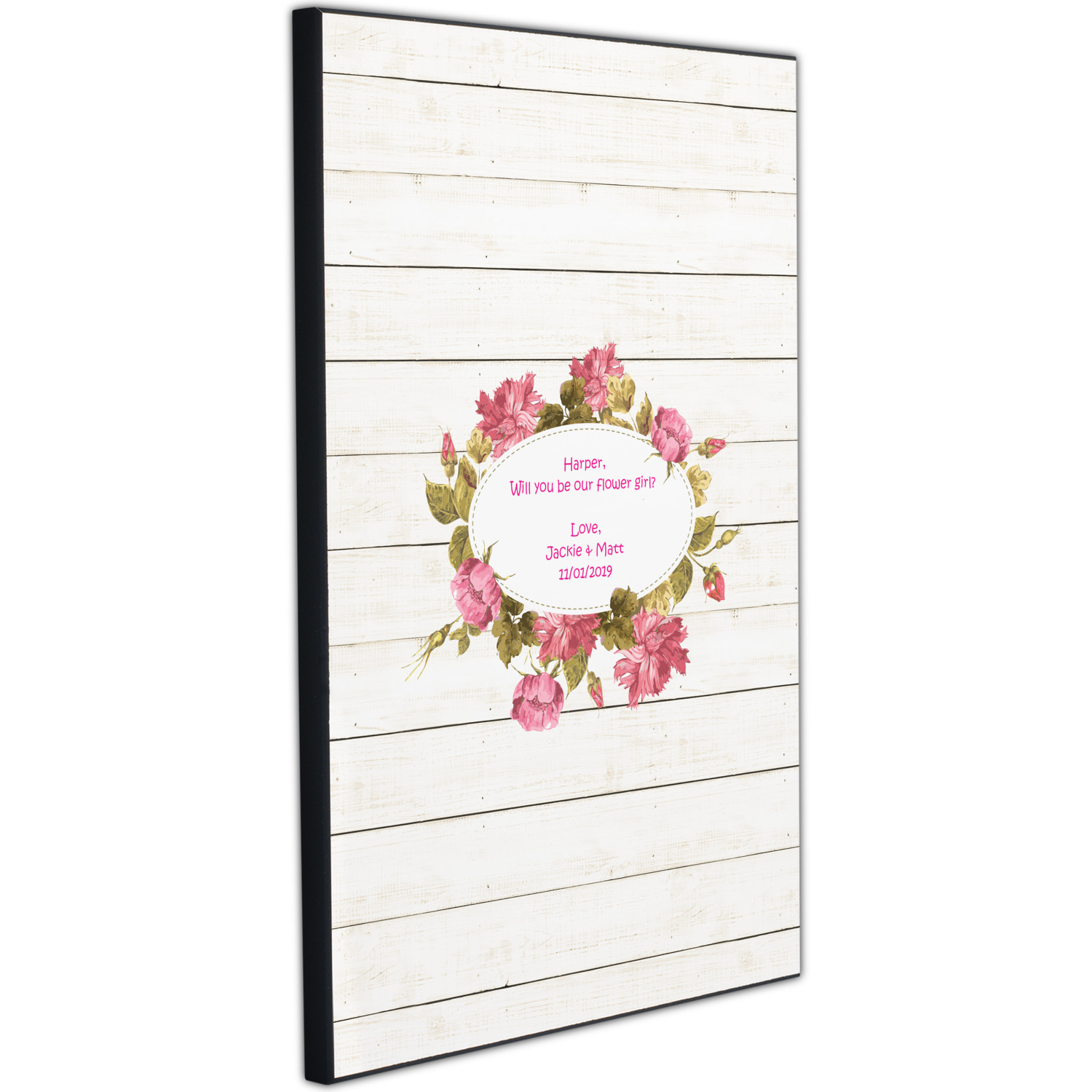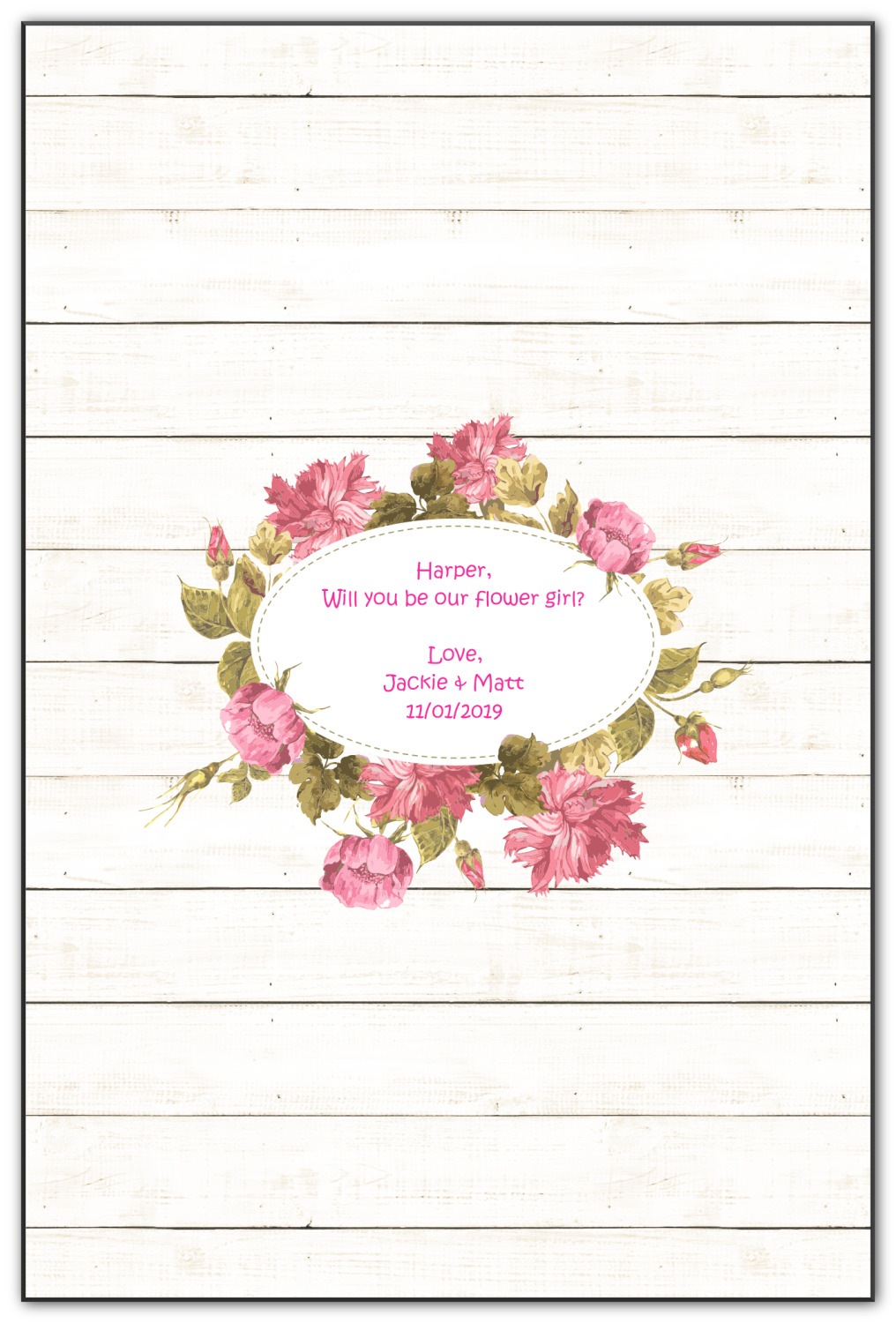 The main design has a background of weathered wooden planks. A beautiful light pink flower frame is used as the focal point of this design. The pink color of the frame and the personalization inside is the perfect contrast to the light colored wood.