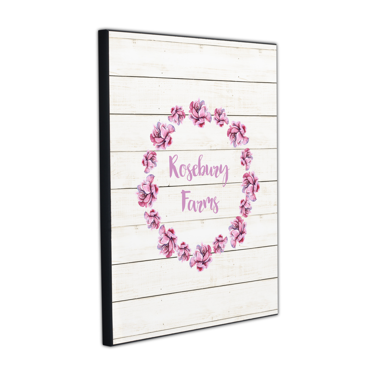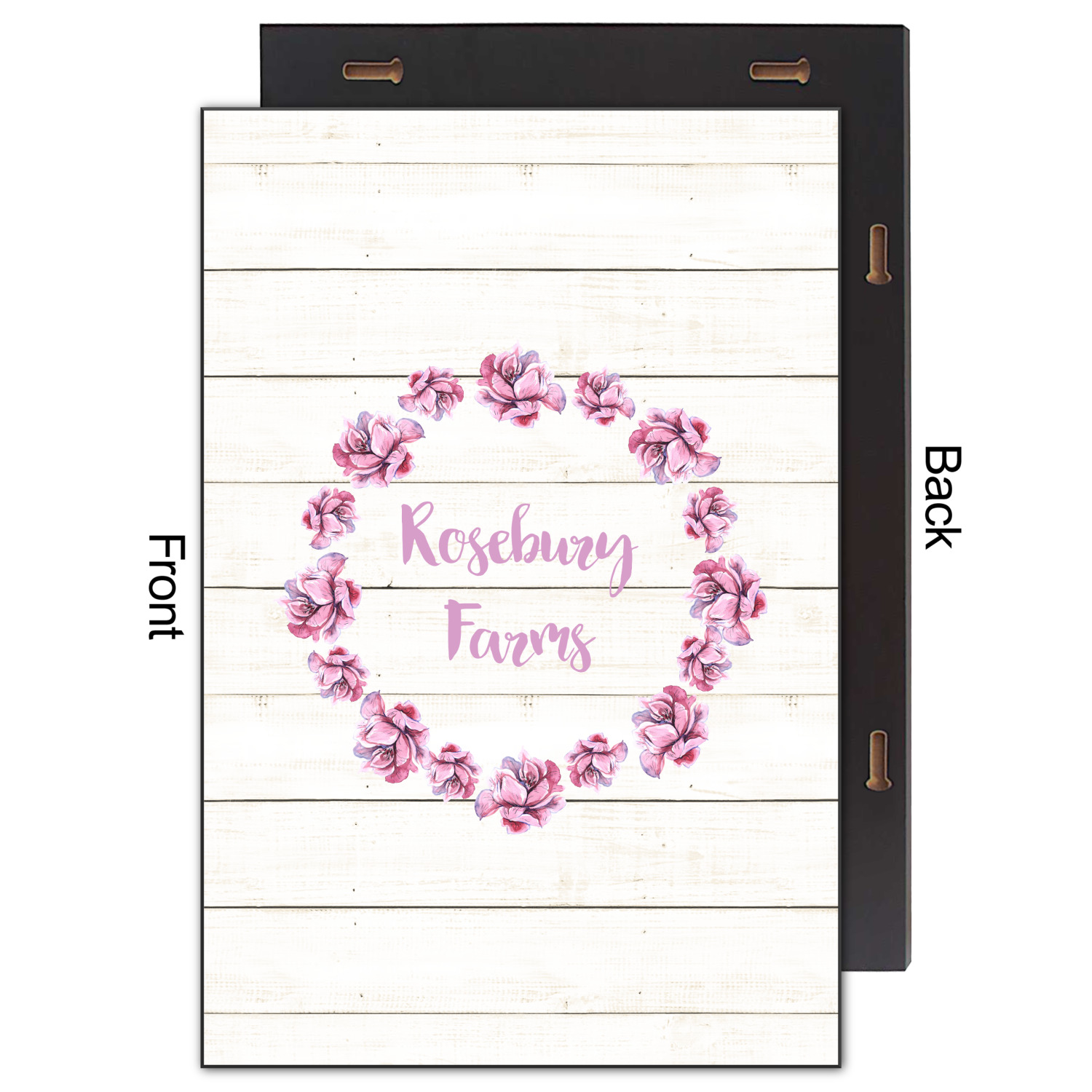 The main design has a background of weathered wooden planks. A beautiful light pink flower frame is used as the focal point of this design. The pink color of the frame and the personalization inside is the perfect contrast to the light colored wood.