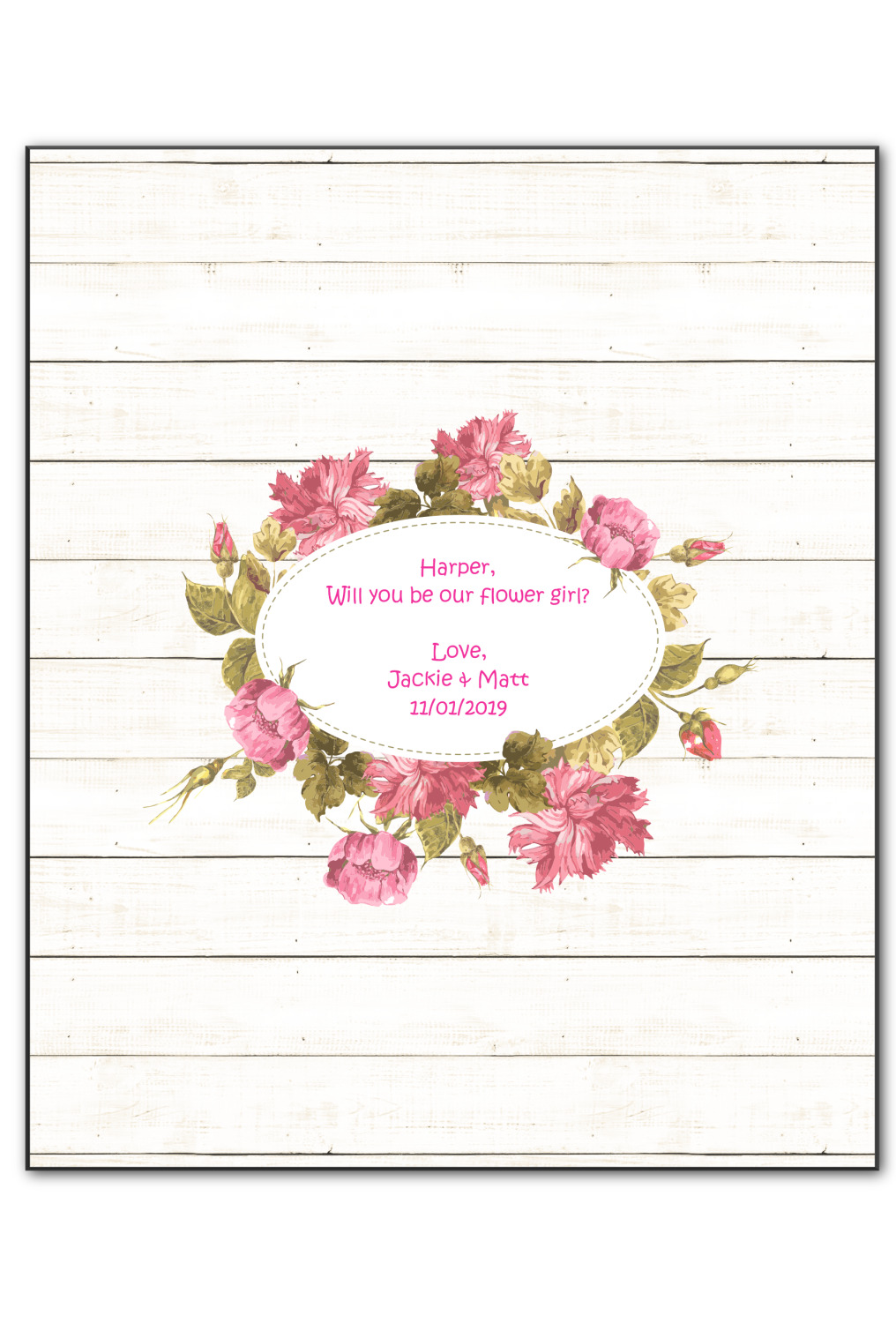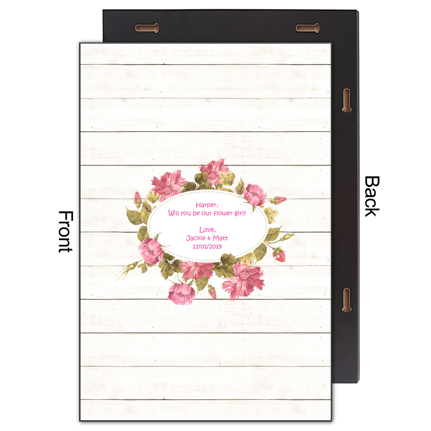 The main design has a background of weathered wooden planks. A beautiful light pink flower frame is used as the focal point of this design. The pink color of the frame and the personalization inside is the perfect contrast to the light colored wood.