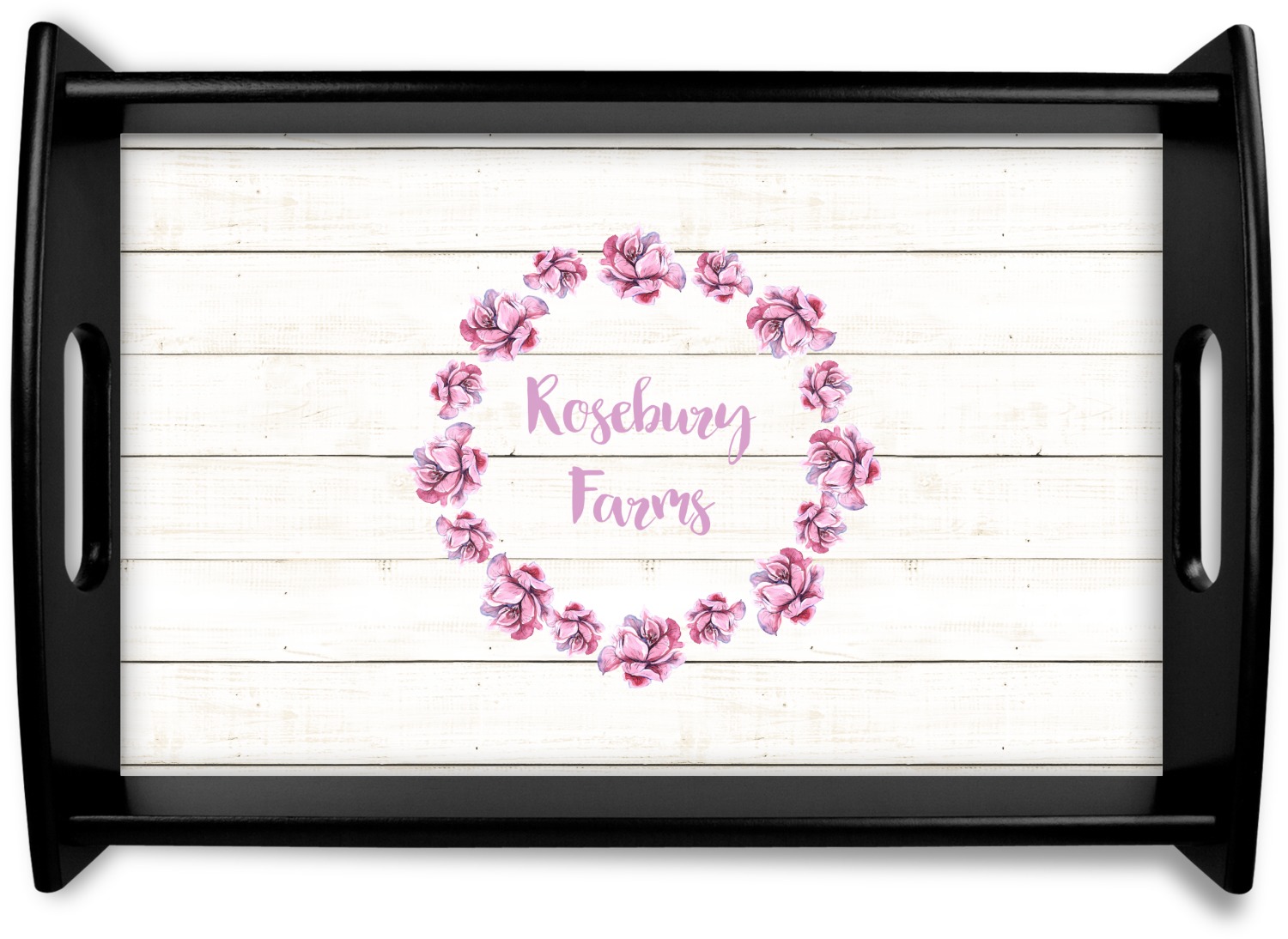 This serving tray with handles features square edges and two rounded sides, creating a very modern look. Each side is fabricated from a beautifully cut, natural wood. The bottom of the interior of the tray displays your customized design in bright, vibrant color. The tray is sold in both a black color and a natural wood look. Each variation of the wood serving tray has two sizes: Small, which is 14" x 10" x 2.25", and Large, which is 19.5" x 13.5" x 2.75".