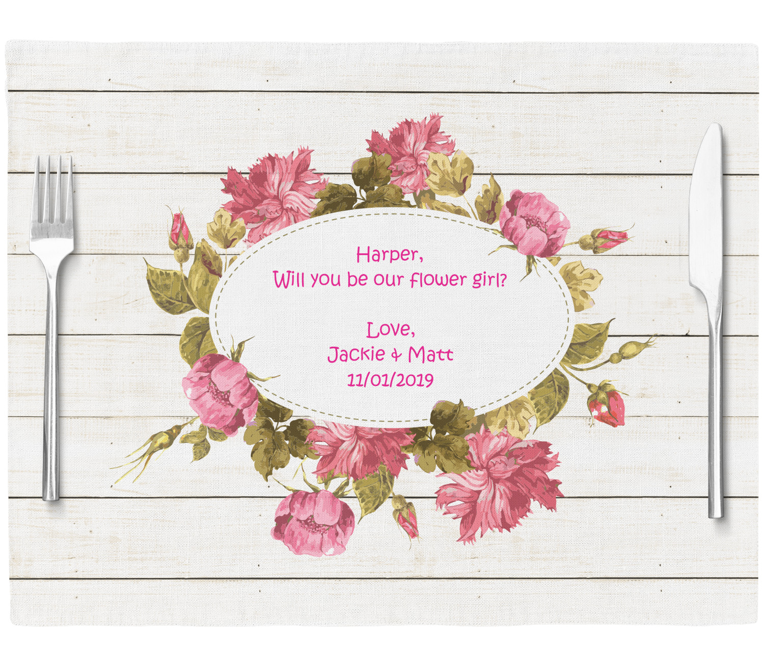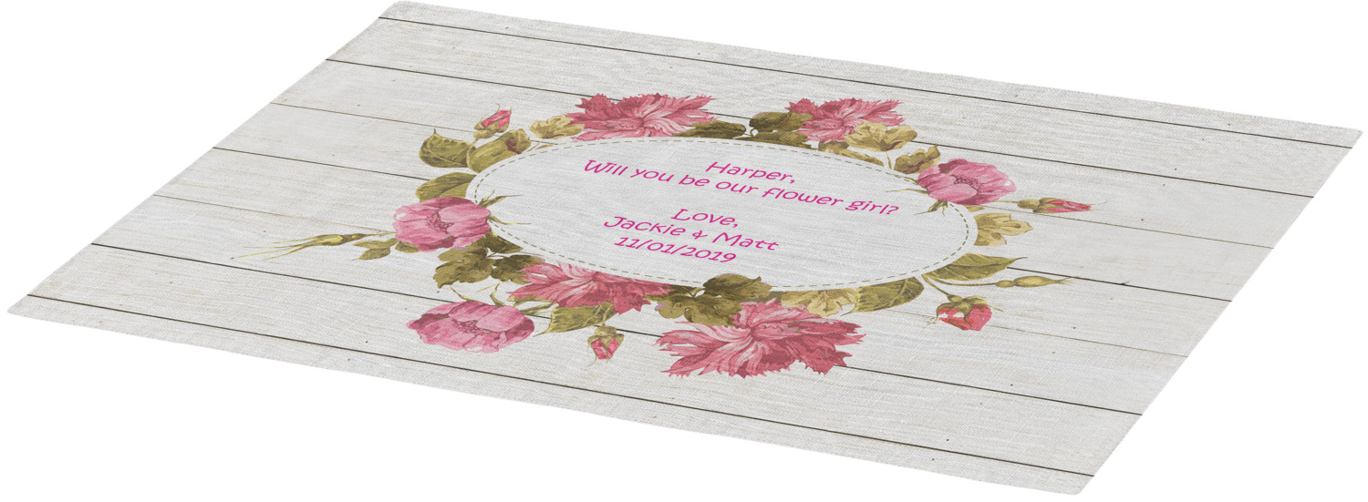 Each of our table mats are a poly twill material with woven burlap detailing. This creates a soft, quality placemat for us to fully print your personalized design across. The woven twill also adds a wrinkle-free surface to set your table! Each customizable placemat is a rectangle shape measuring at approximately 13 x 18 and printed here in the USA.