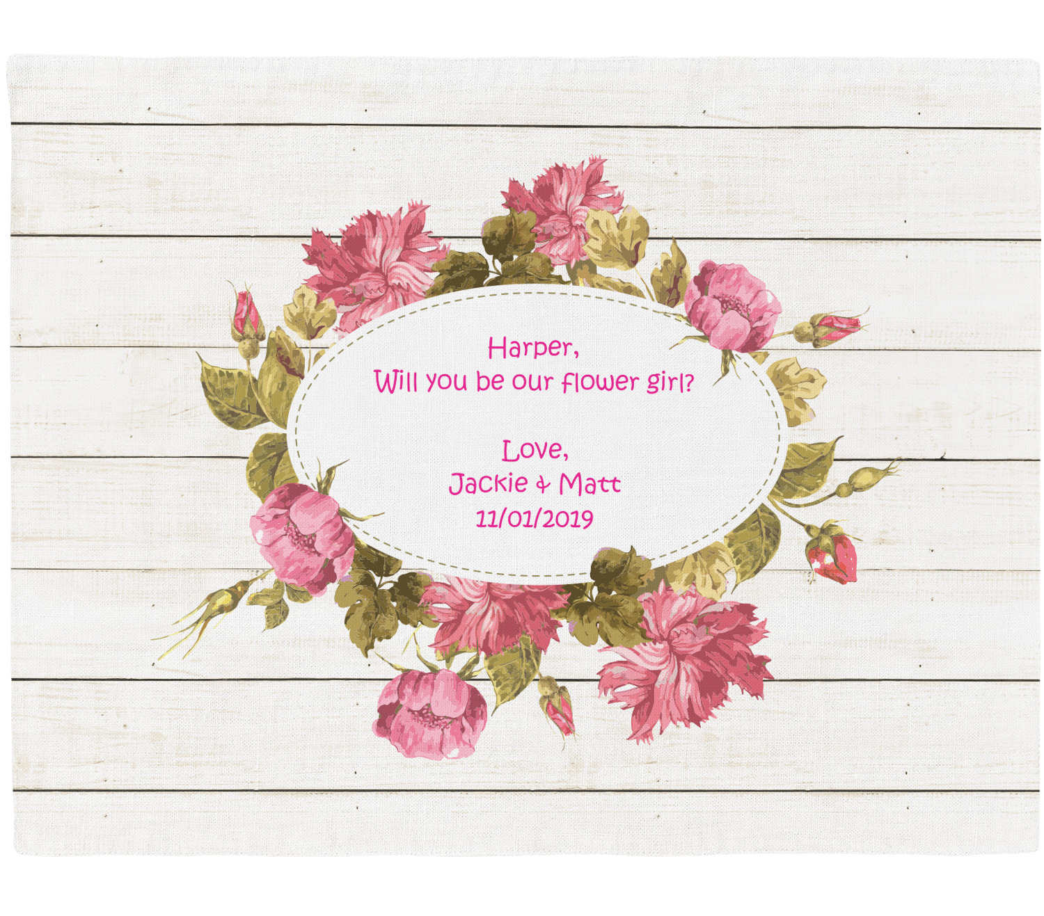 The main design has a background of weathered wooden planks. A beautiful light pink flower frame is used as the focal point of this design. The pink color of the frame and the personalization inside is the perfect contrast to the light colored wood.