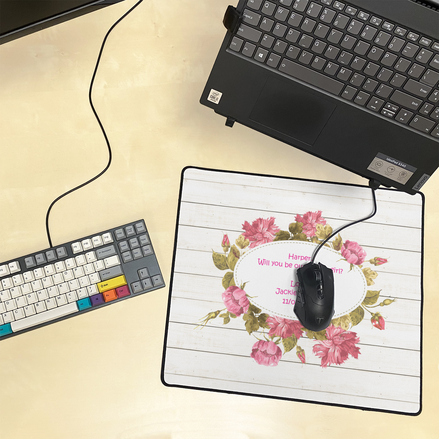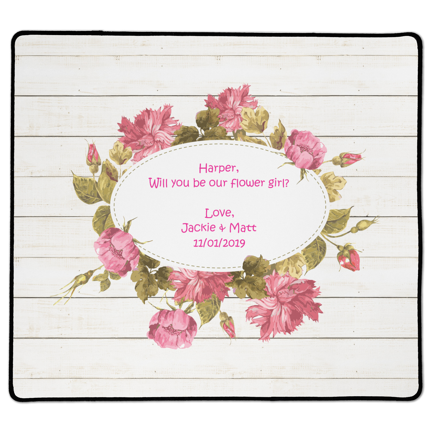 The main design has a background of weathered wooden planks. A beautiful light pink flower frame is used as the focal point of this design. The pink color of the frame and the personalization inside is the perfect contrast to the light colored wood.