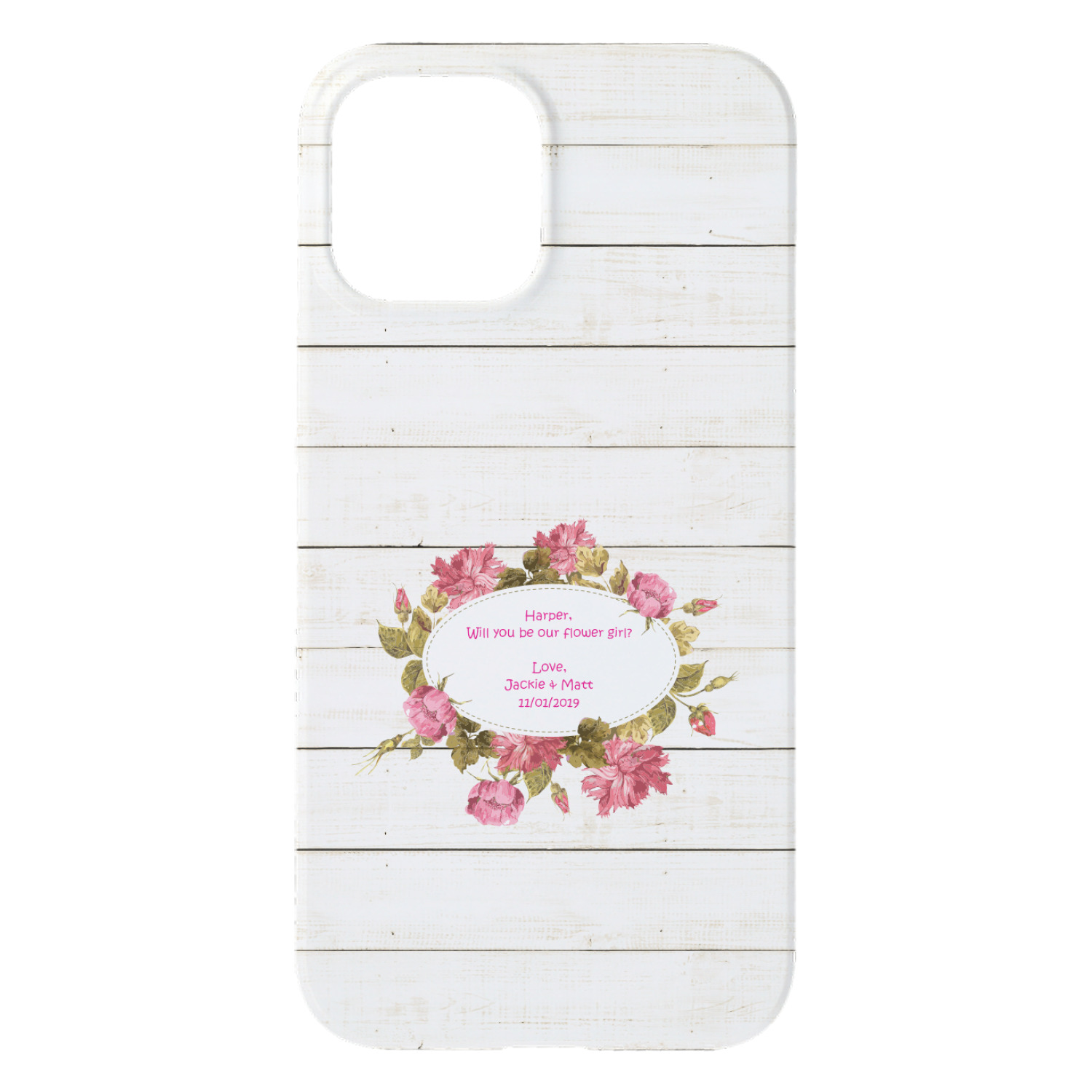 The main design has a background of weathered wooden planks. A beautiful light pink flower frame is used as the focal point of this design. The pink color of the frame and the personalization inside is the perfect contrast to the light colored wood.