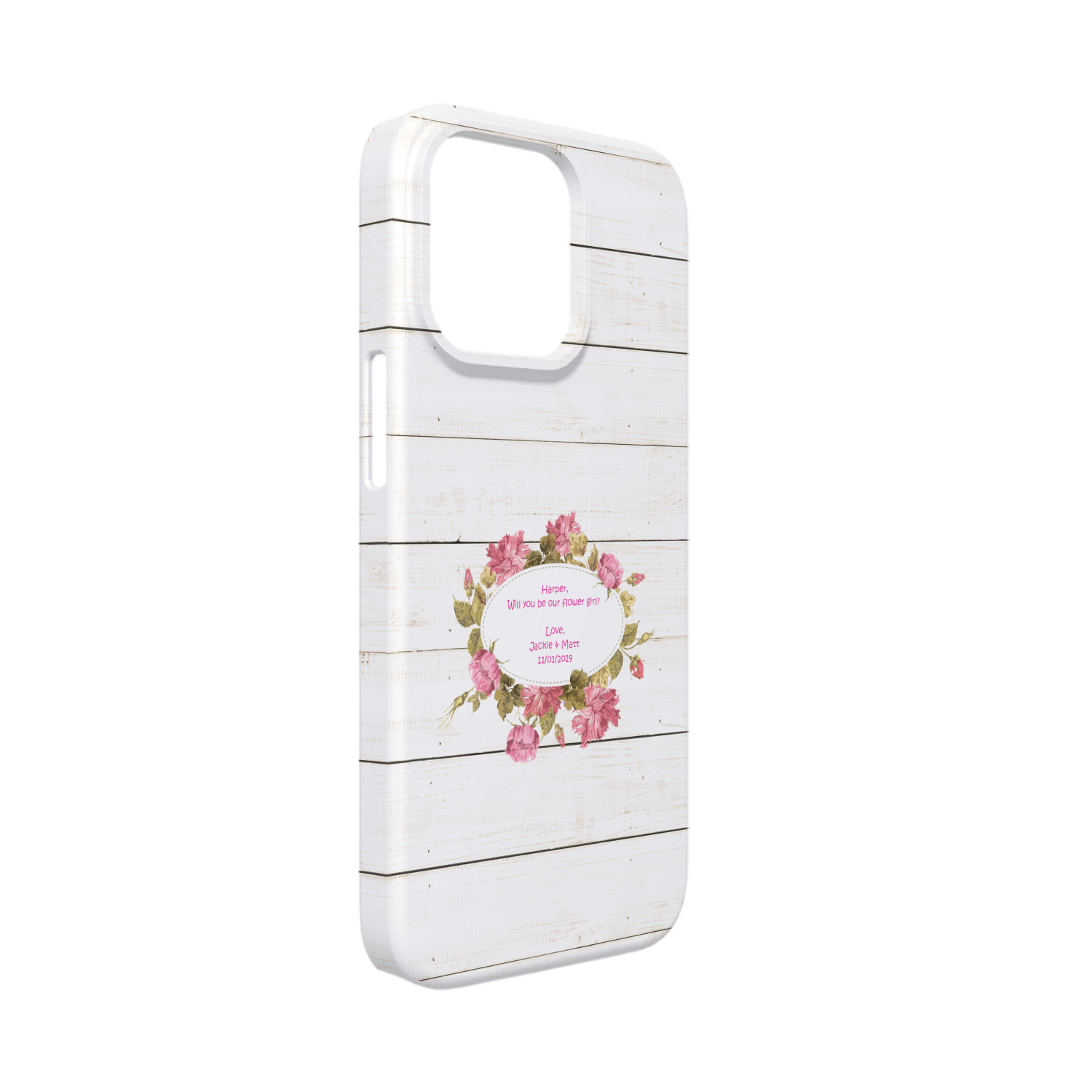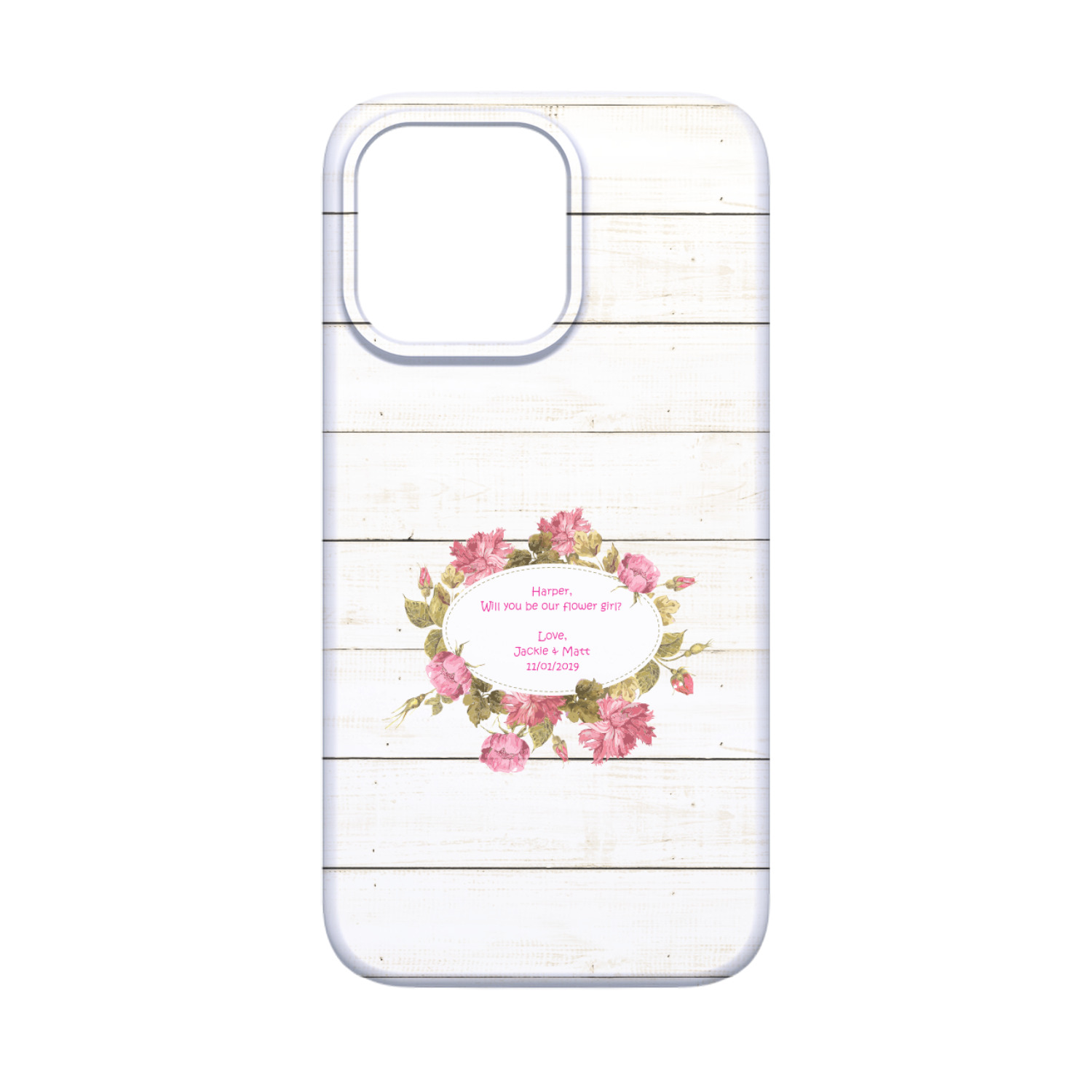 The main design has a background of weathered wooden planks. A beautiful light pink flower frame is used as the focal point of this design. The pink color of the frame and the personalization inside is the perfect contrast to the light colored wood.