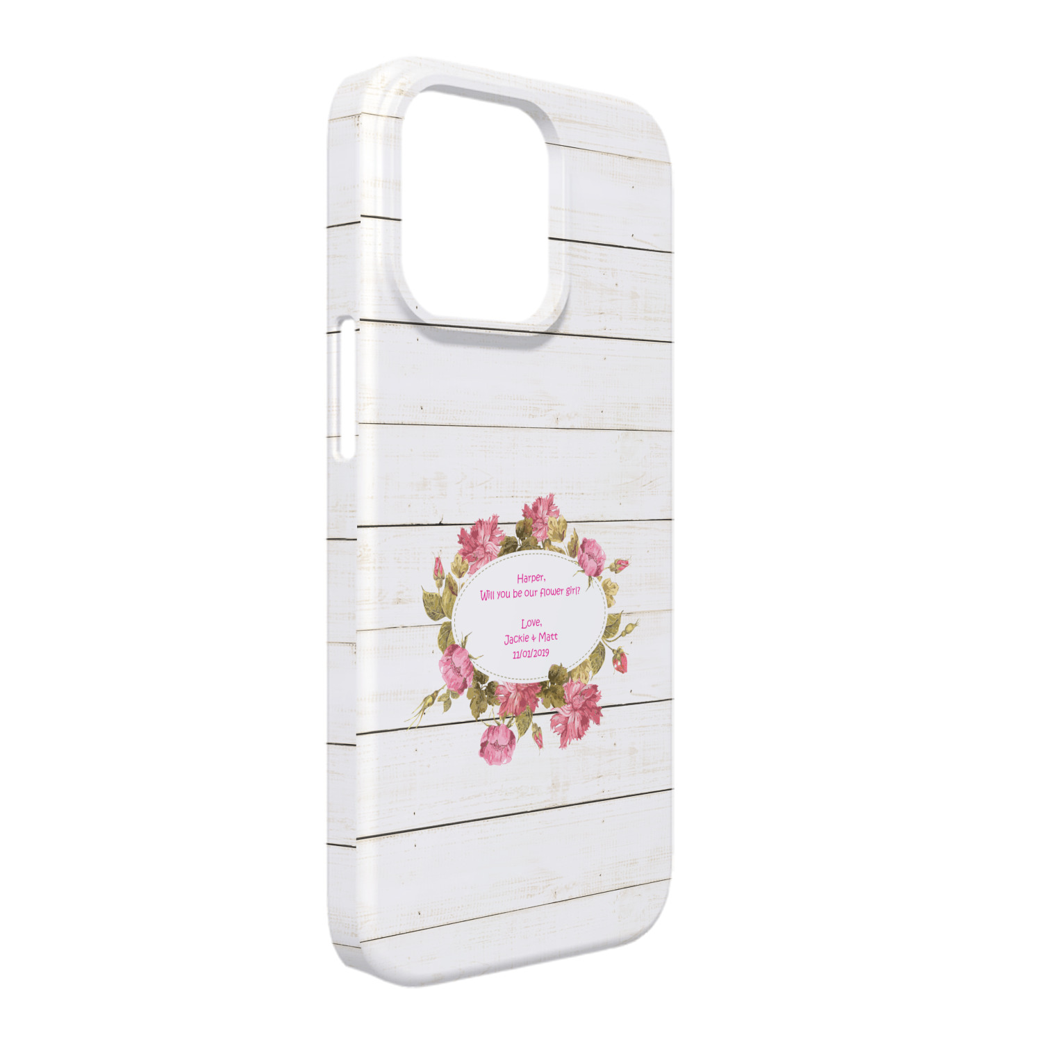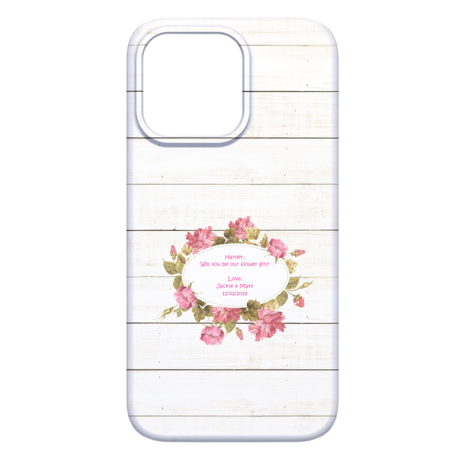 The main design has a background of weathered wooden planks. A beautiful light pink flower frame is used as the focal point of this design. The pink color of the frame and the personalization inside is the perfect contrast to the light colored wood.