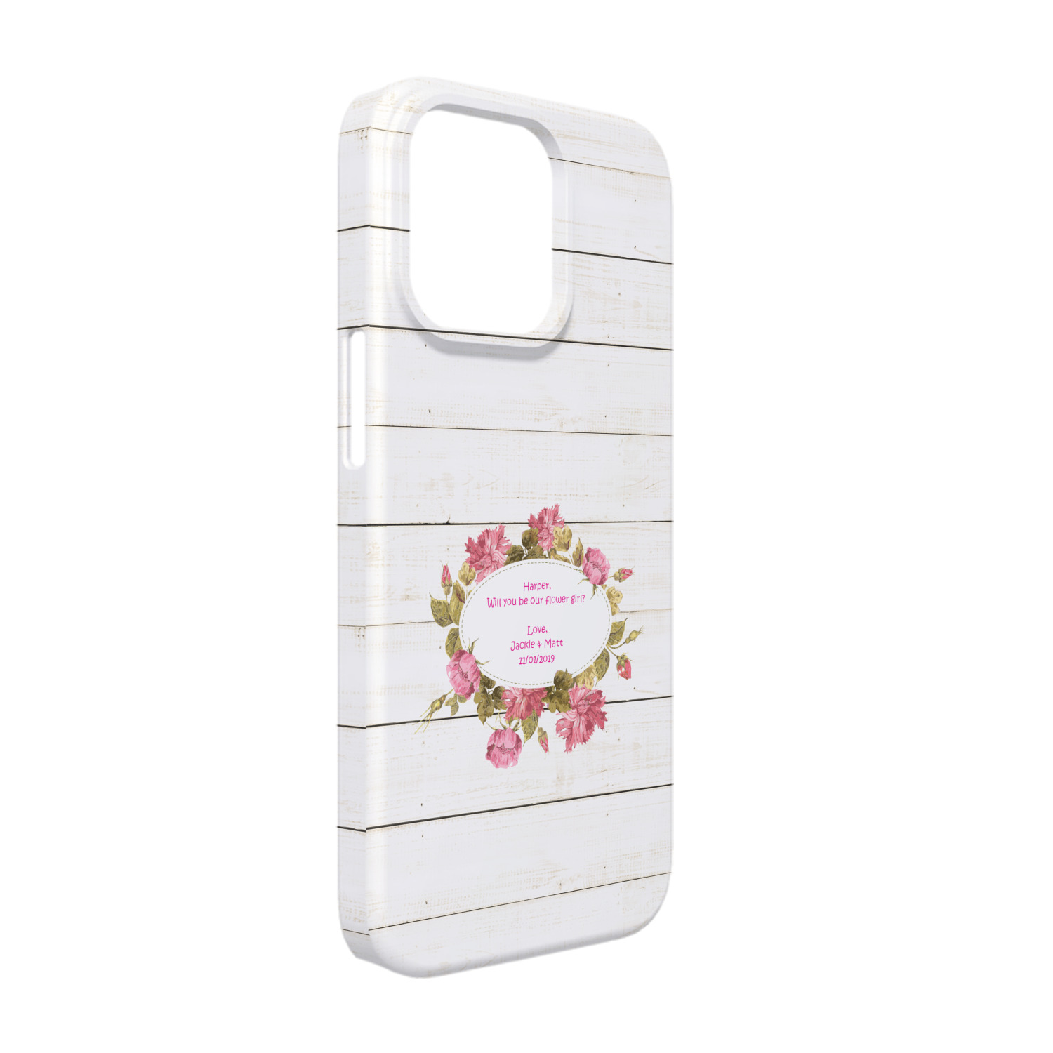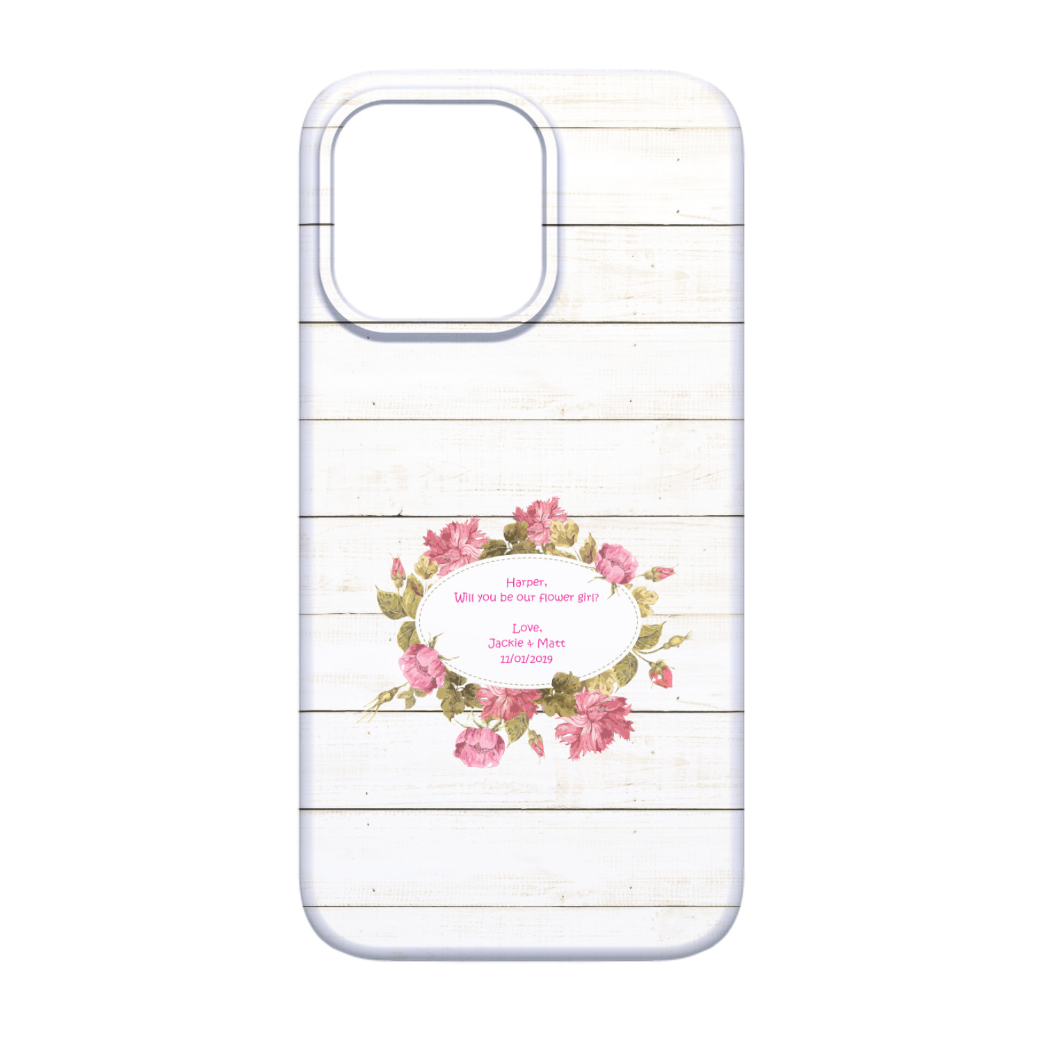 The main design has a background of weathered wooden planks. A beautiful light pink flower frame is used as the focal point of this design. The pink color of the frame and the personalization inside is the perfect contrast to the light colored wood.