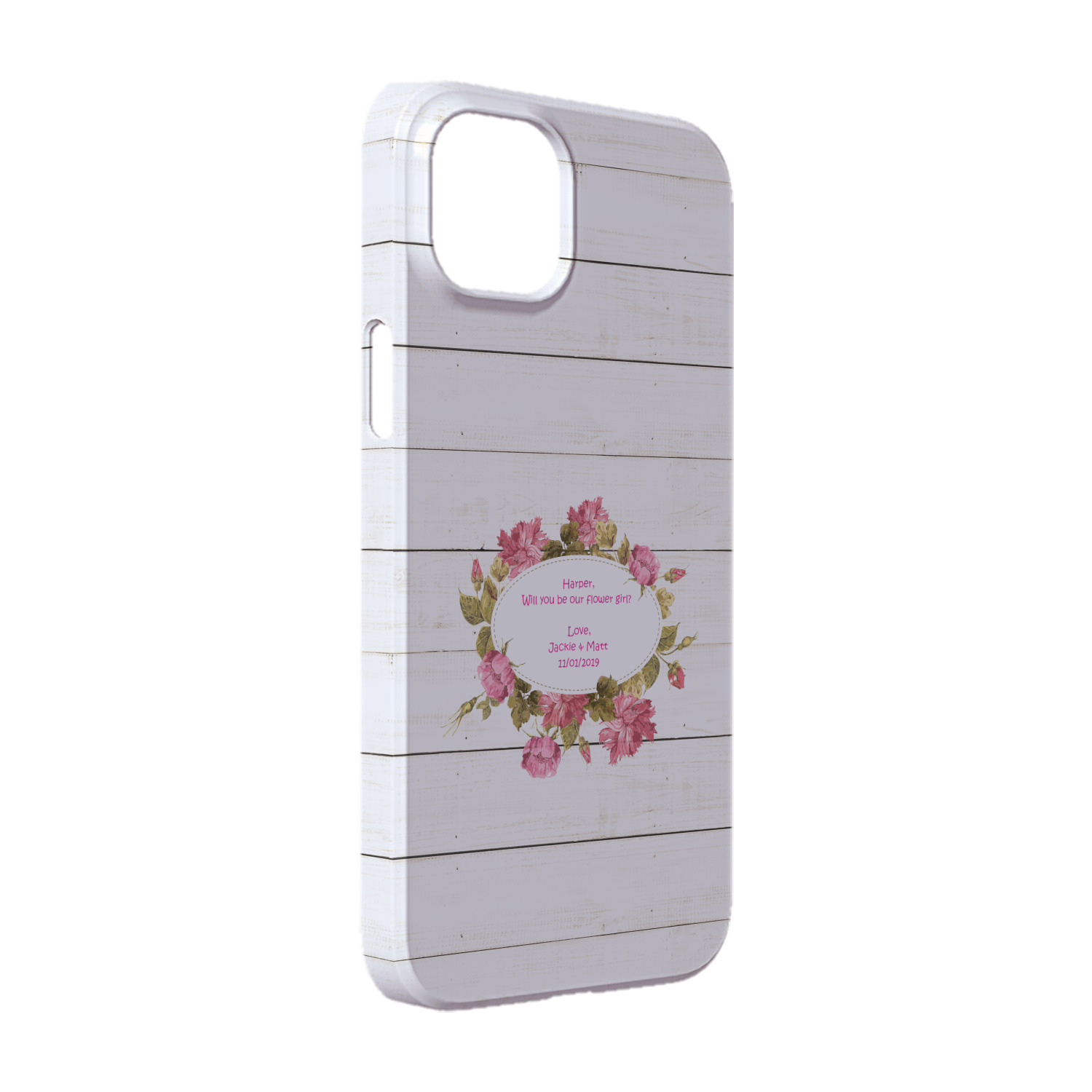 The main design has a background of weathered wooden planks. A beautiful light pink flower frame is used as the focal point of this design. The pink color of the frame and the personalization inside is the perfect contrast to the light colored wood.