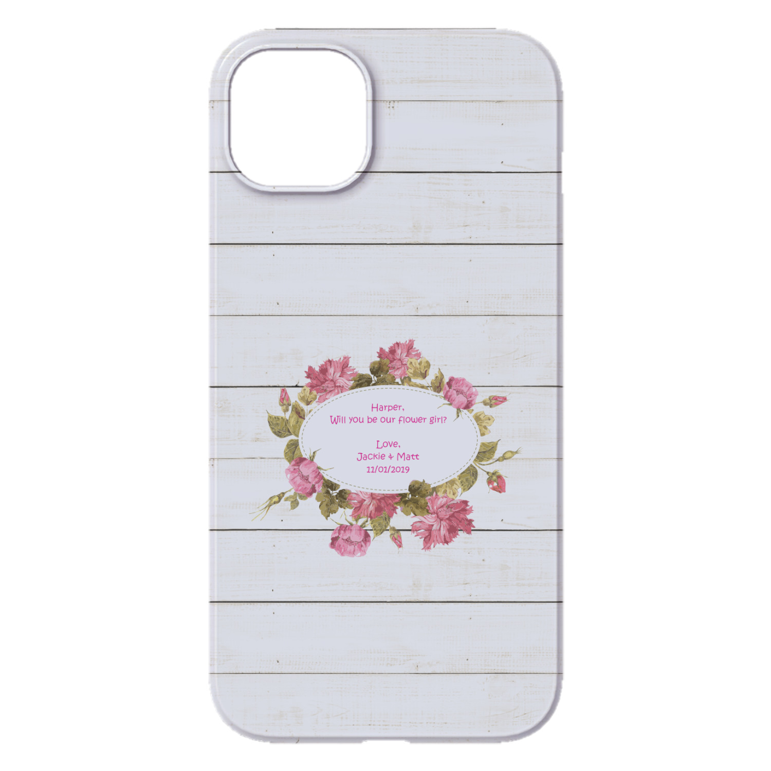 The main design has a background of weathered wooden planks. A beautiful light pink flower frame is used as the focal point of this design. The pink color of the frame and the personalization inside is the perfect contrast to the light colored wood.