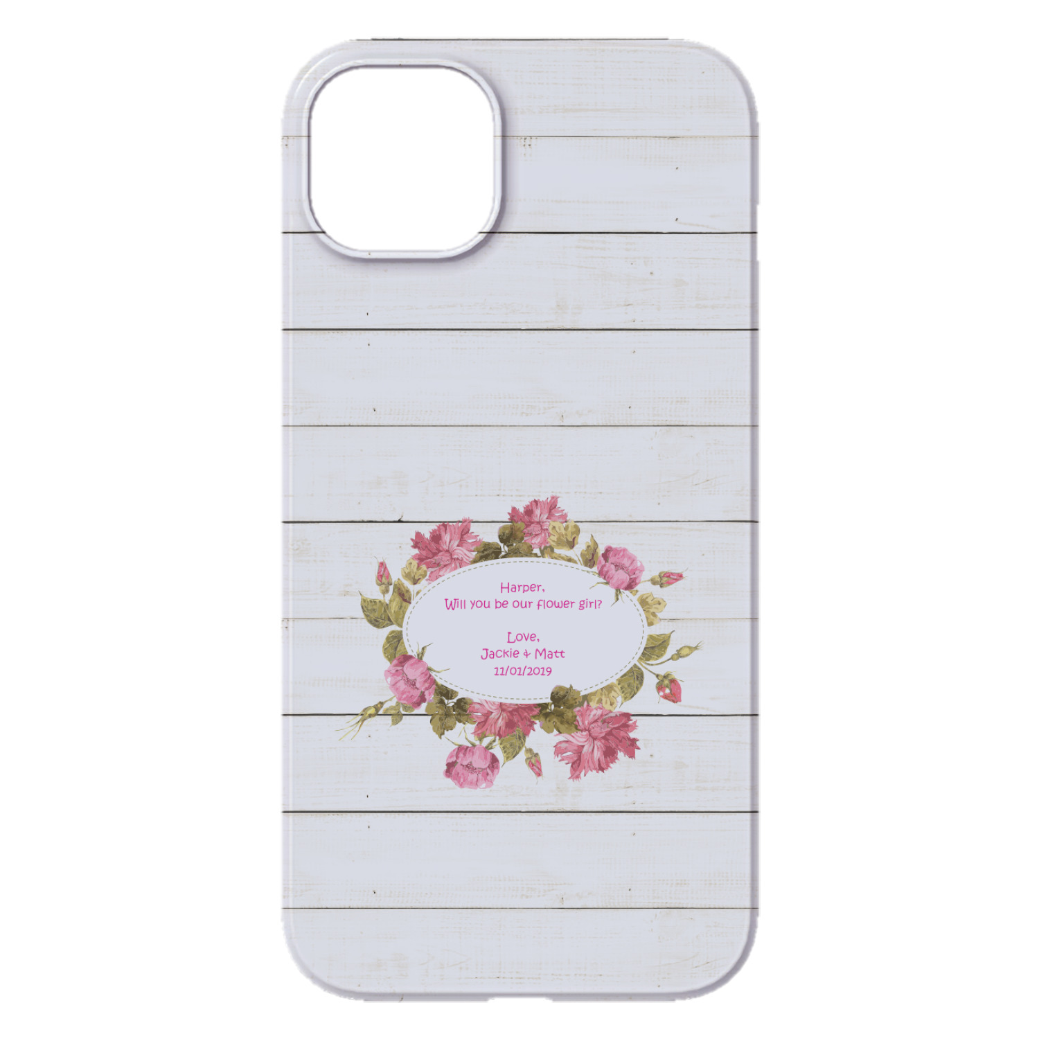 The main design has a background of weathered wooden planks. A beautiful light pink flower frame is used as the focal point of this design. The pink color of the frame and the personalization inside is the perfect contrast to the light colored wood.
