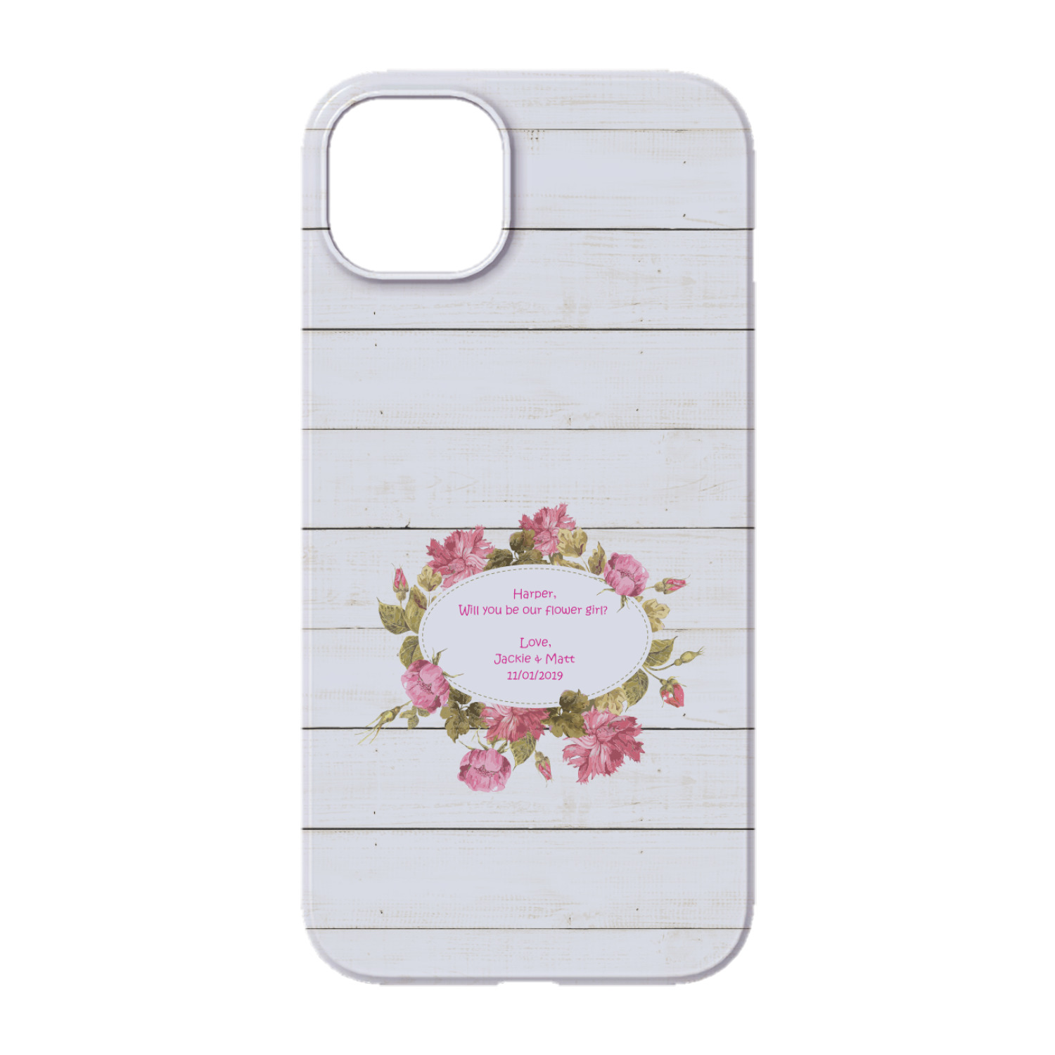 The main design has a background of weathered wooden planks. A beautiful light pink flower frame is used as the focal point of this design. The pink color of the frame and the personalization inside is the perfect contrast to the light colored wood.