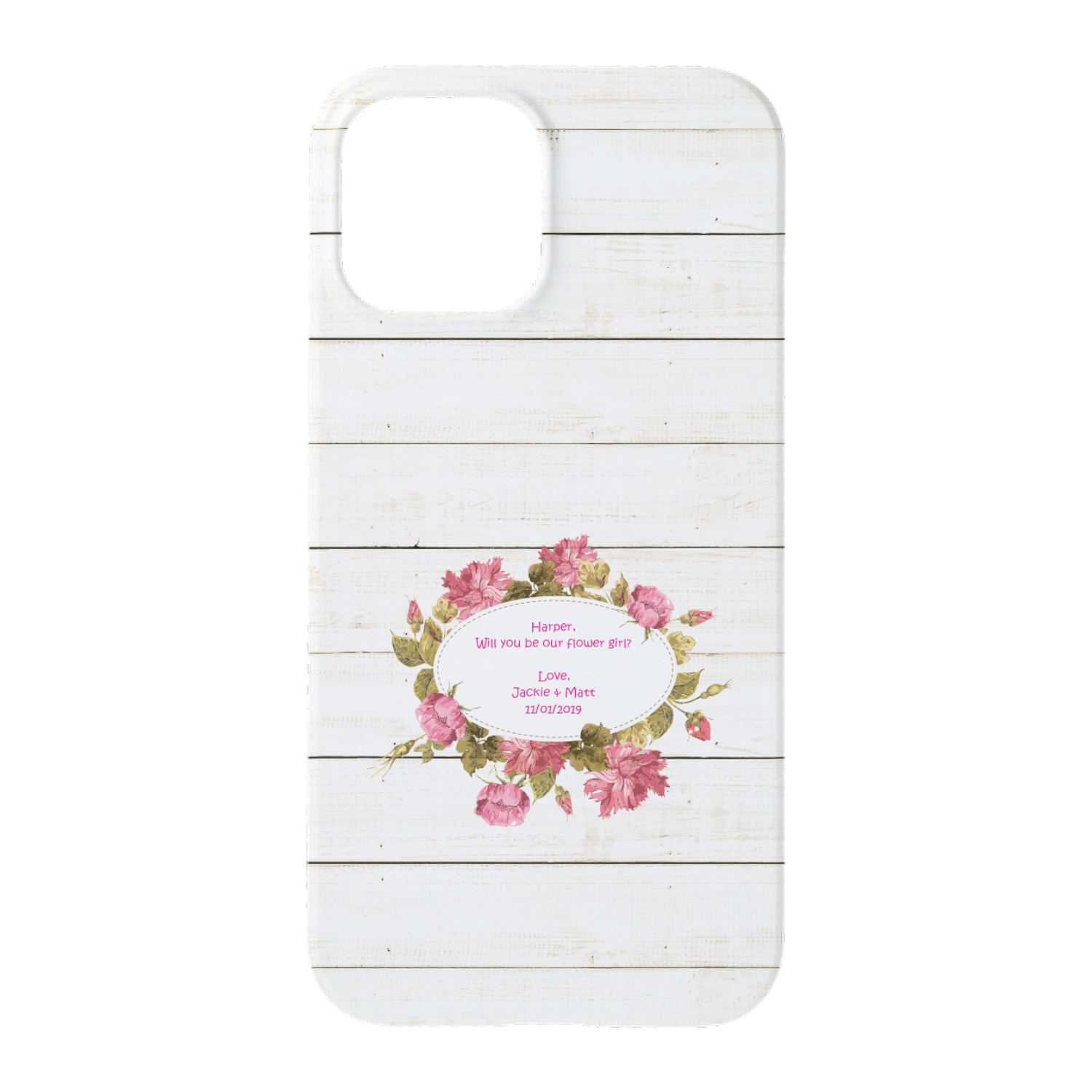 The main design has a background of weathered wooden planks. A beautiful light pink flower frame is used as the focal point of this design. The pink color of the frame and the personalization inside is the perfect contrast to the light colored wood.
