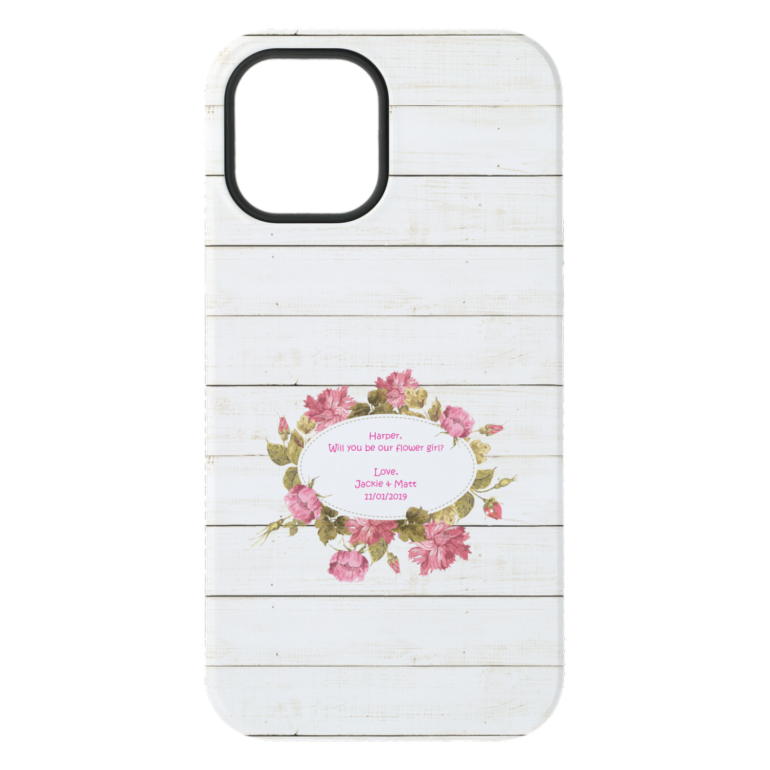 The main design has a background of weathered wooden planks. A beautiful light pink flower frame is used as the focal point of this design. The pink color of the frame and the personalization inside is the perfect contrast to the light colored wood.
