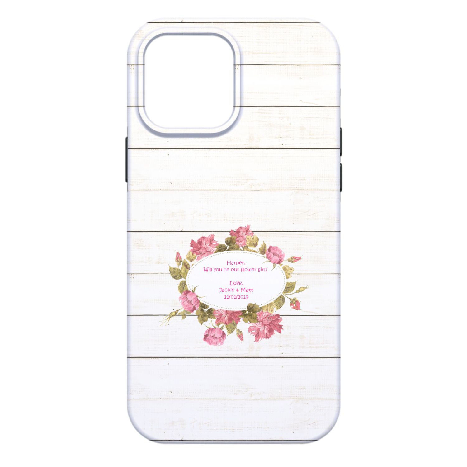 The main design has a background of weathered wooden planks. A beautiful light pink flower frame is used as the focal point of this design. The pink color of the frame and the personalization inside is the perfect contrast to the light colored wood.