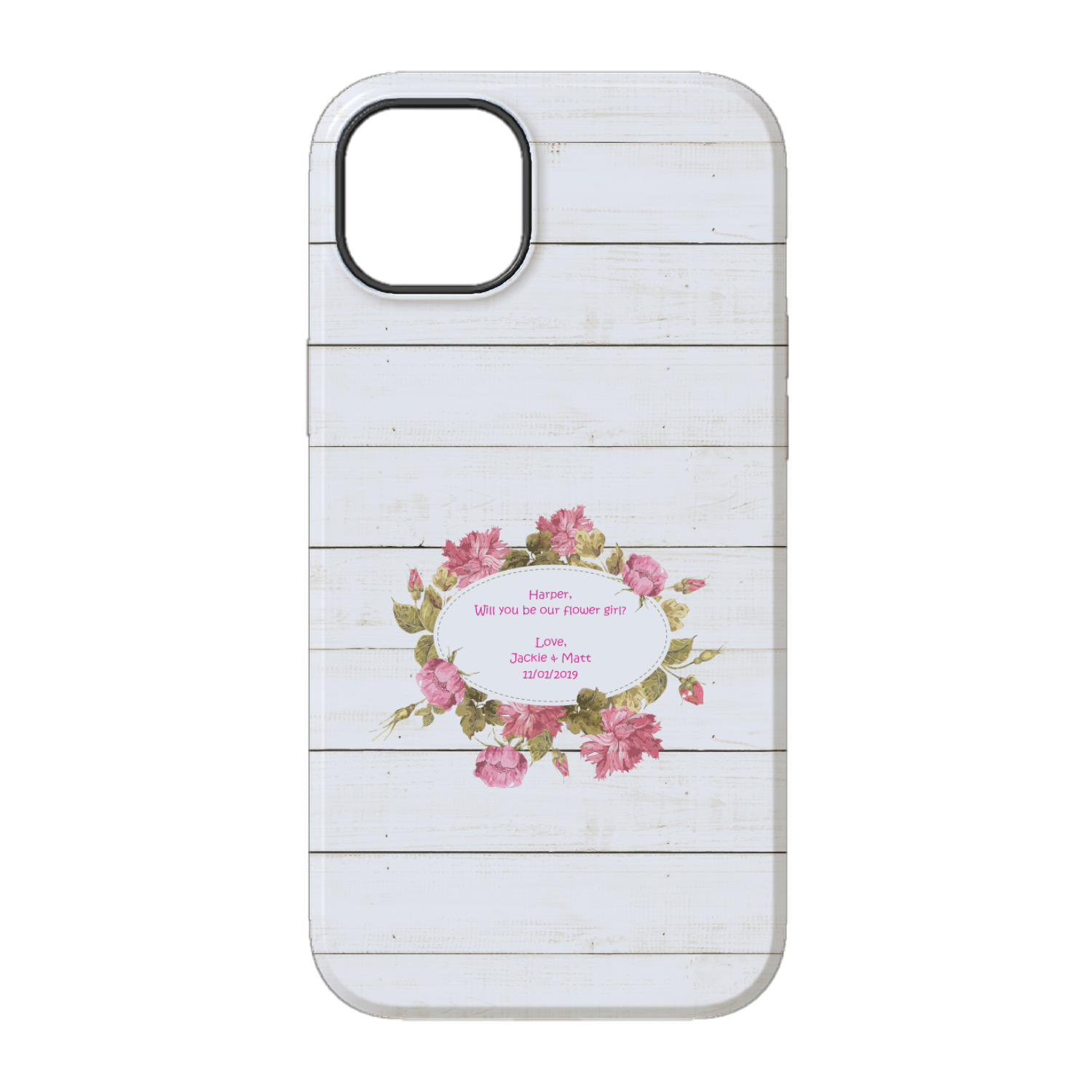 The main design has a background of weathered wooden planks. A beautiful light pink flower frame is used as the focal point of this design. The pink color of the frame and the personalization inside is the perfect contrast to the light colored wood.