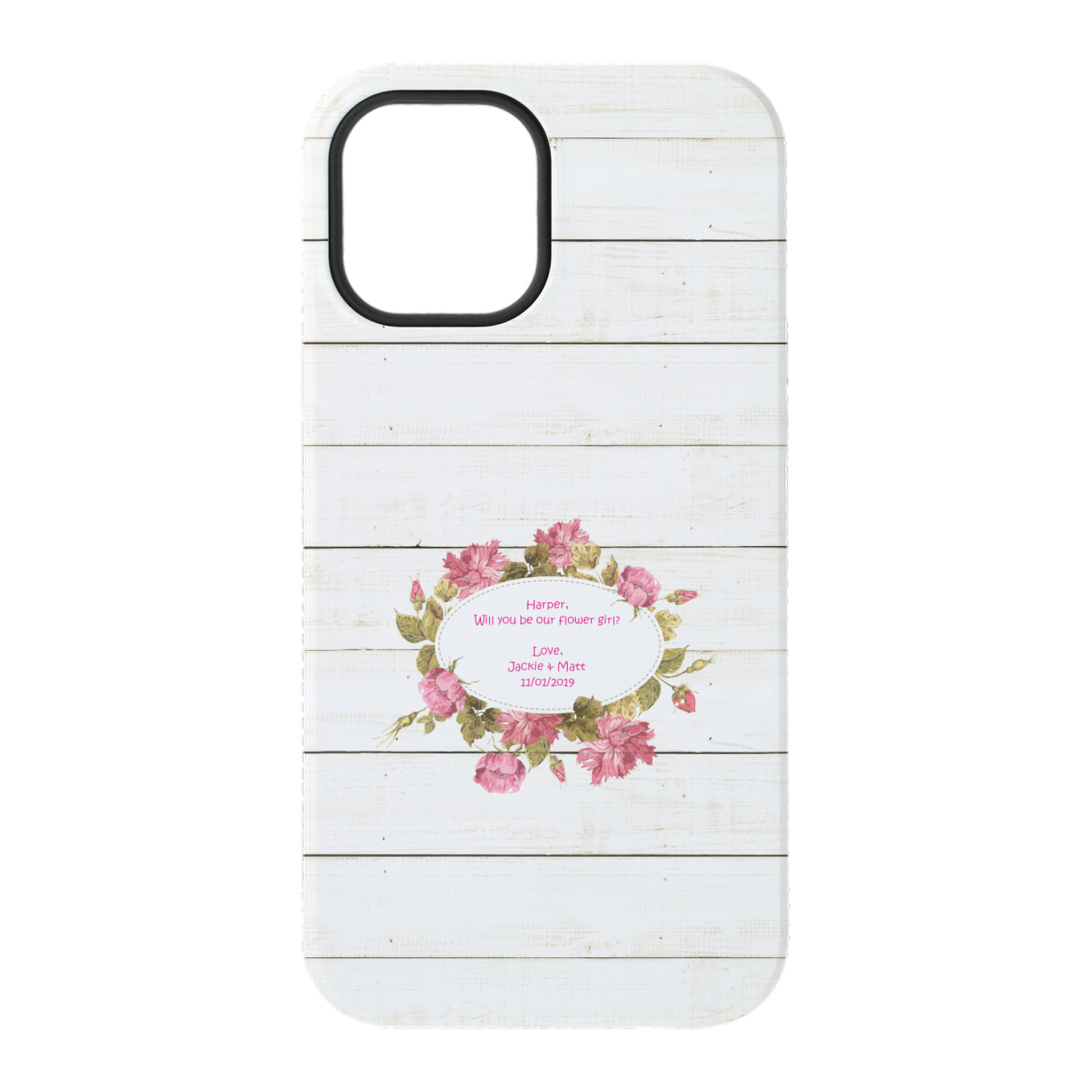 The main design has a background of weathered wooden planks. A beautiful light pink flower frame is used as the focal point of this design. The pink color of the frame and the personalization inside is the perfect contrast to the light colored wood.