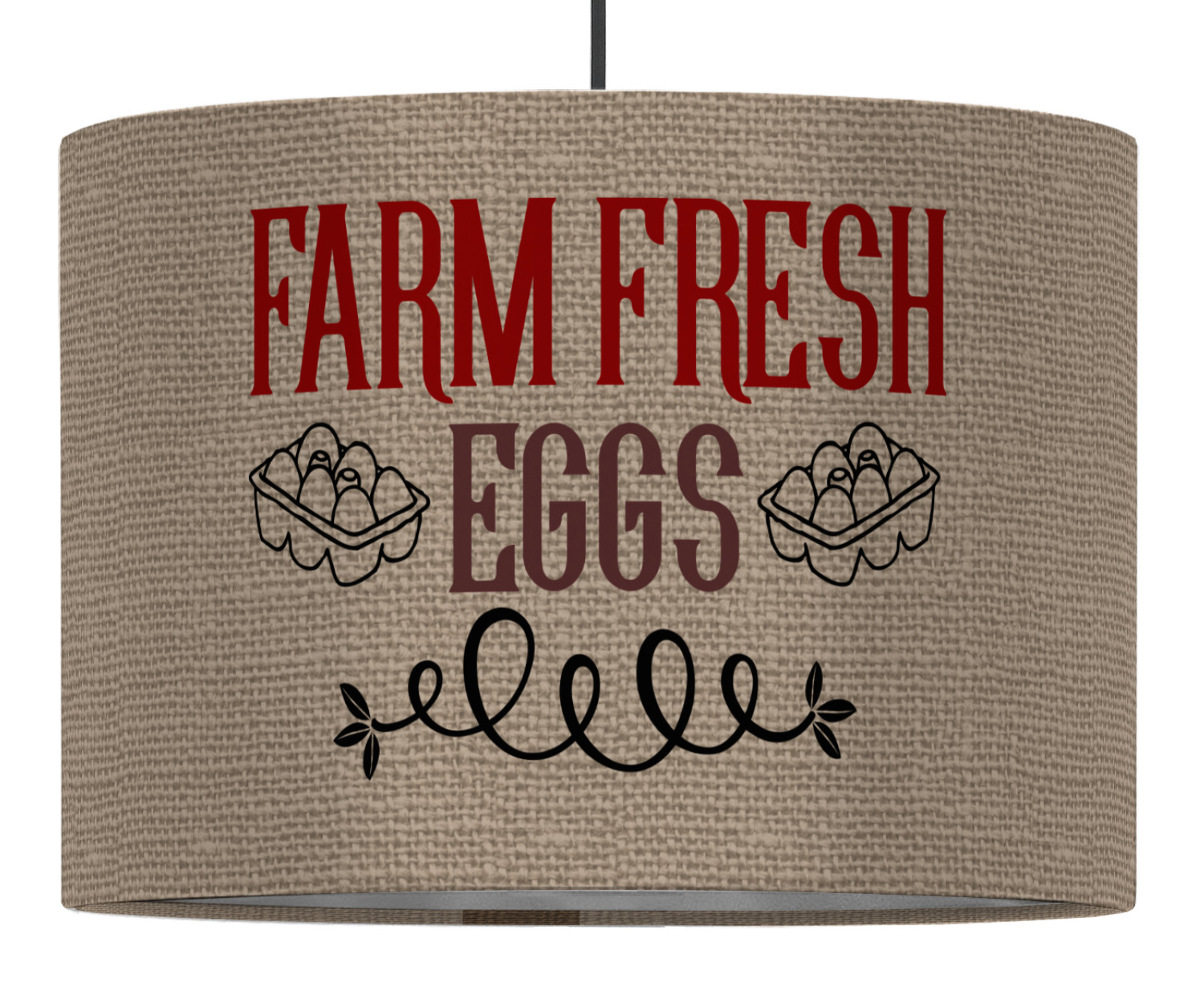 This design uses the quote "farm fresh eggs" with two crates of eggs pictured on either side and a beautiful scrolling design below. The quote has a bright and dark red, both which stand out beautifully against the burlap textured background. This quote and a chicken graphic are used throughout the design.