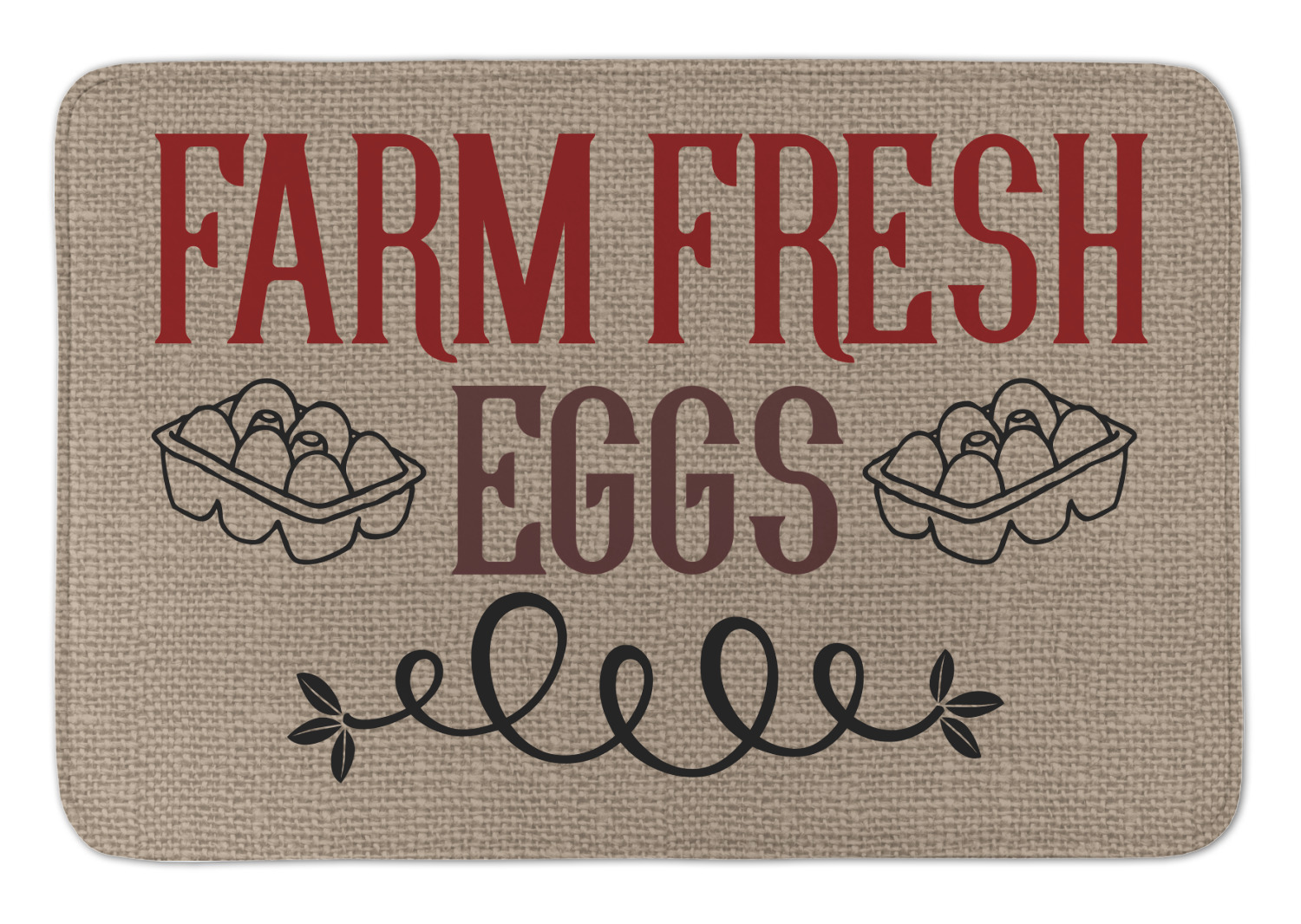 This design uses the quote "farm fresh eggs" with two crates of eggs pictured on either side and a beautiful scrolling design below. The quote has a bright and dark red, both which stand out beautifully against the burlap textured background. This quote and a chicken graphic are used throughout the design.