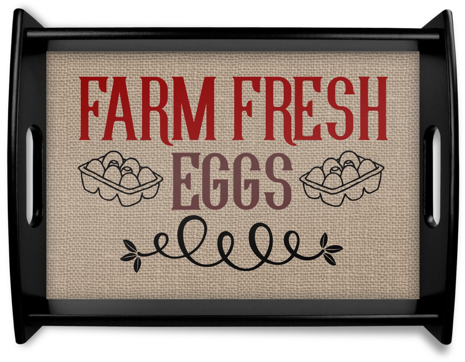 This serving tray with handles features square edges and two rounded sides, creating a very modern look. Each side is fabricated from a beautifully cut, natural wood. The bottom of the interior of the tray displays your customized design in bright, vibrant color. The tray is sold in both a black color and a natural wood look. Each variation of the wood serving tray has two sizes: Small, which is 14" x 10" x 2.25", and Large, which is 19.5" x 13.5" x 2.75".