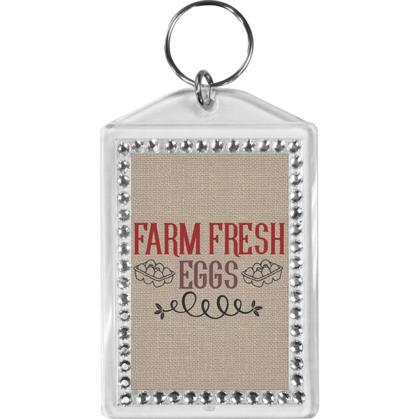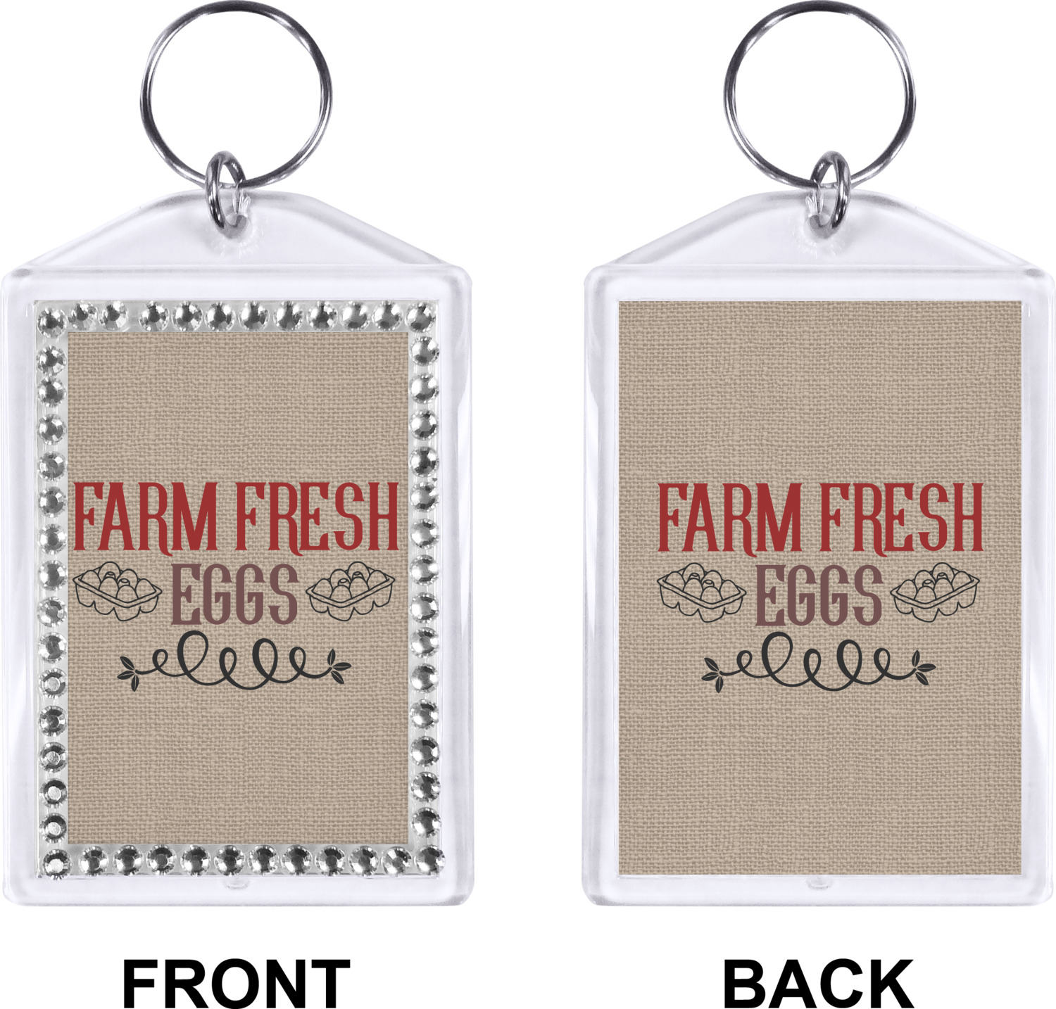 Our personalized keychains have a bold, rectangular shape, outlined by a series of shimmering rhinestones. A metal, split keyring is included with your purchase, and an additional metal hoop allows for attachment of the keychain to the split ring. This unique keychain measures at about 3.75 by 2.5 inches. We print your customized design(s) across both the back and front of this keychain.