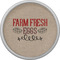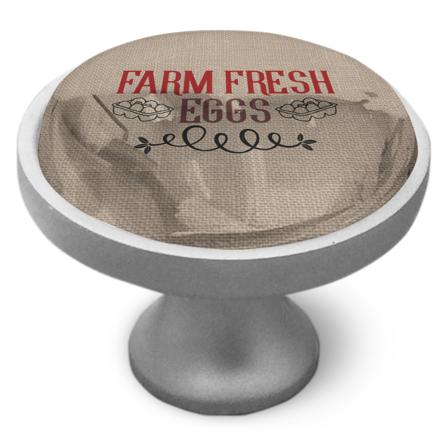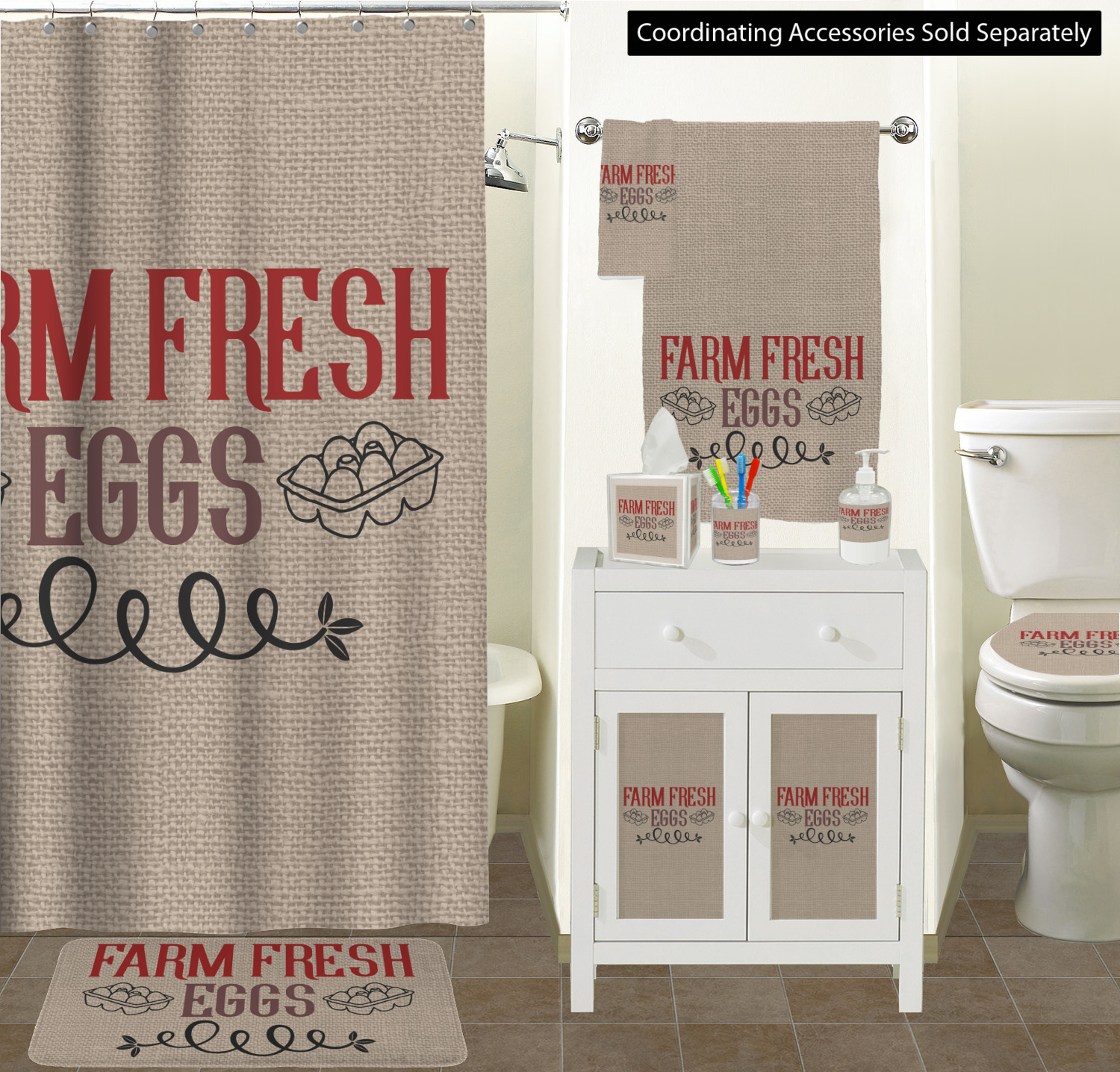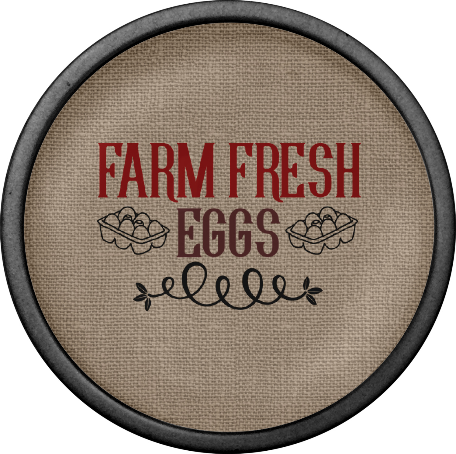 This design uses the quote "farm fresh eggs" with two crates of eggs pictured on either side and a beautiful scrolling design below. The quote has a bright and dark red, both which stand out beautifully against the burlap textured background. This quote and a chicken graphic are used throughout the design.