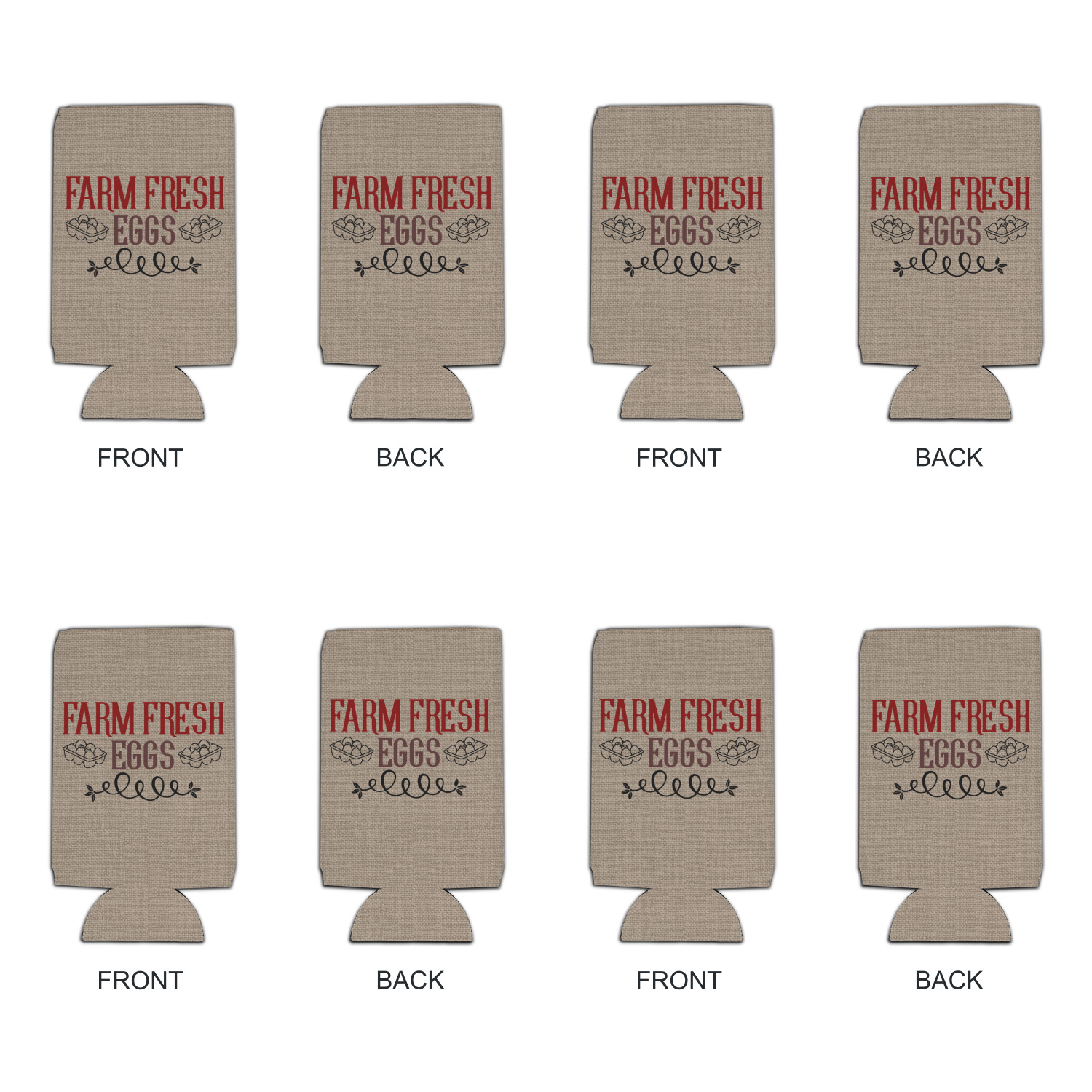 This design uses the quote "farm fresh eggs" with two crates of eggs pictured on either side and a beautiful scrolling design below. The quote has a bright and dark red, both which stand out beautifully against the burlap textured background. This quote and a chicken graphic are used throughout the design.